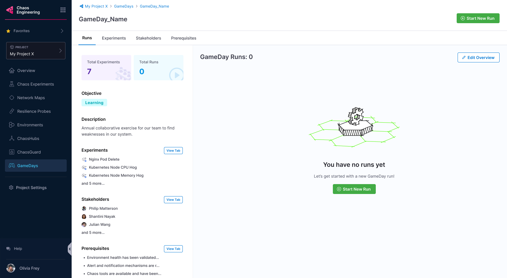 If you have created your GameDay earlier, select Start New Run to run the GameDay; otherwise, create a GameDay.