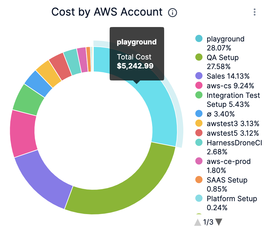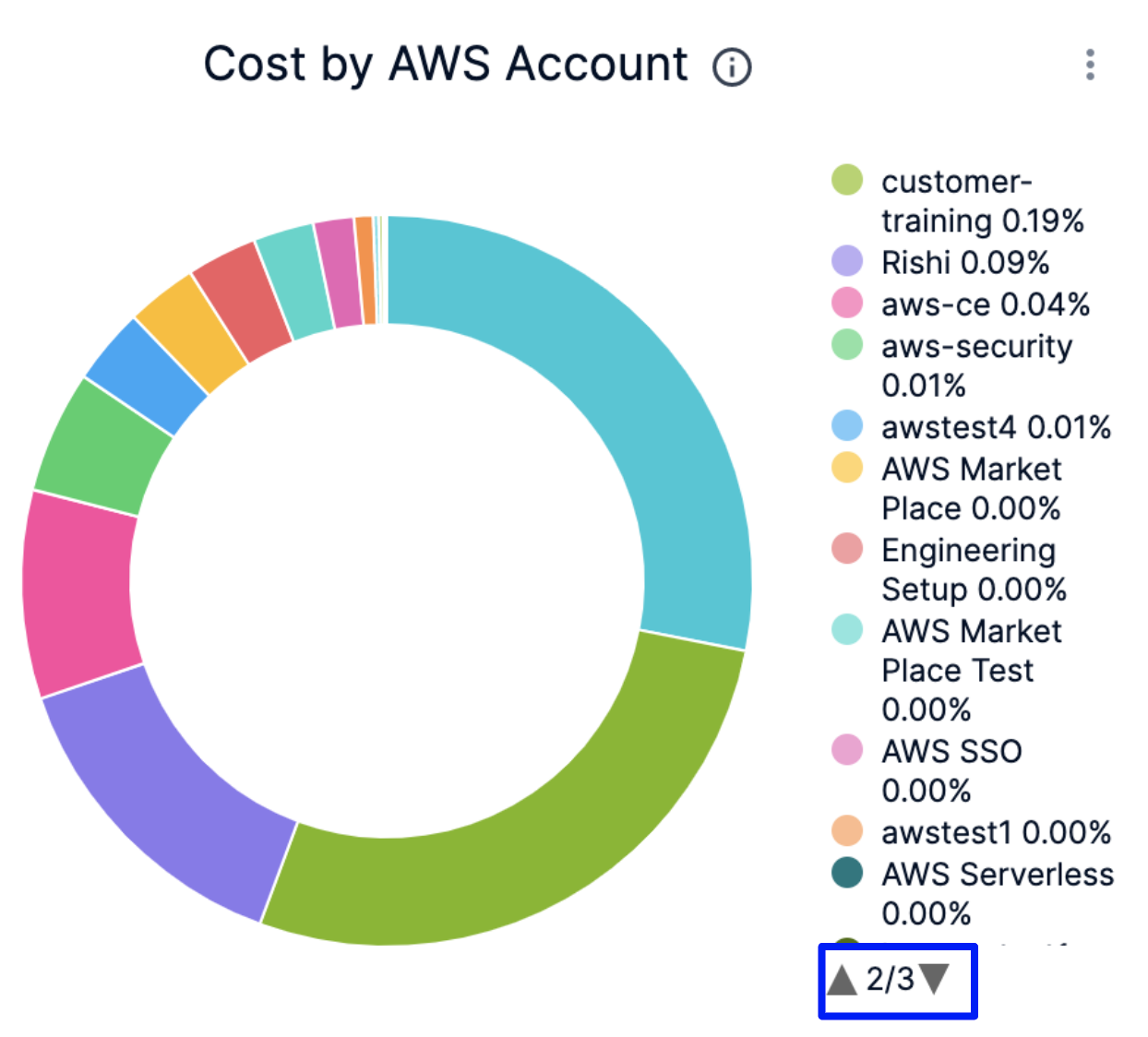 4. In Cost by AWS Account, click the up or down arrow button to scroll up or down the list. The list shows the percentage of each AWS account with respect to the cost contribution.