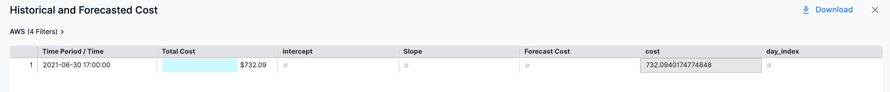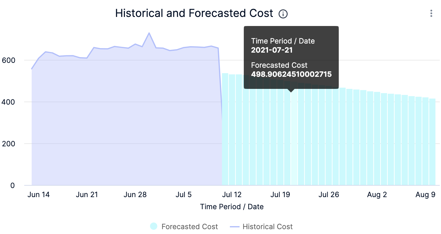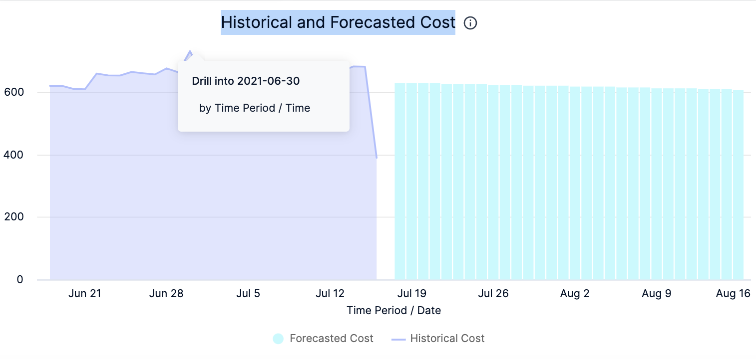 Forecasted CostThe forecasted cloud cost with cost trend. Forecasted cost is the prediction based on your historical cost data, and it is predicted for the same future time period as your selected time range.