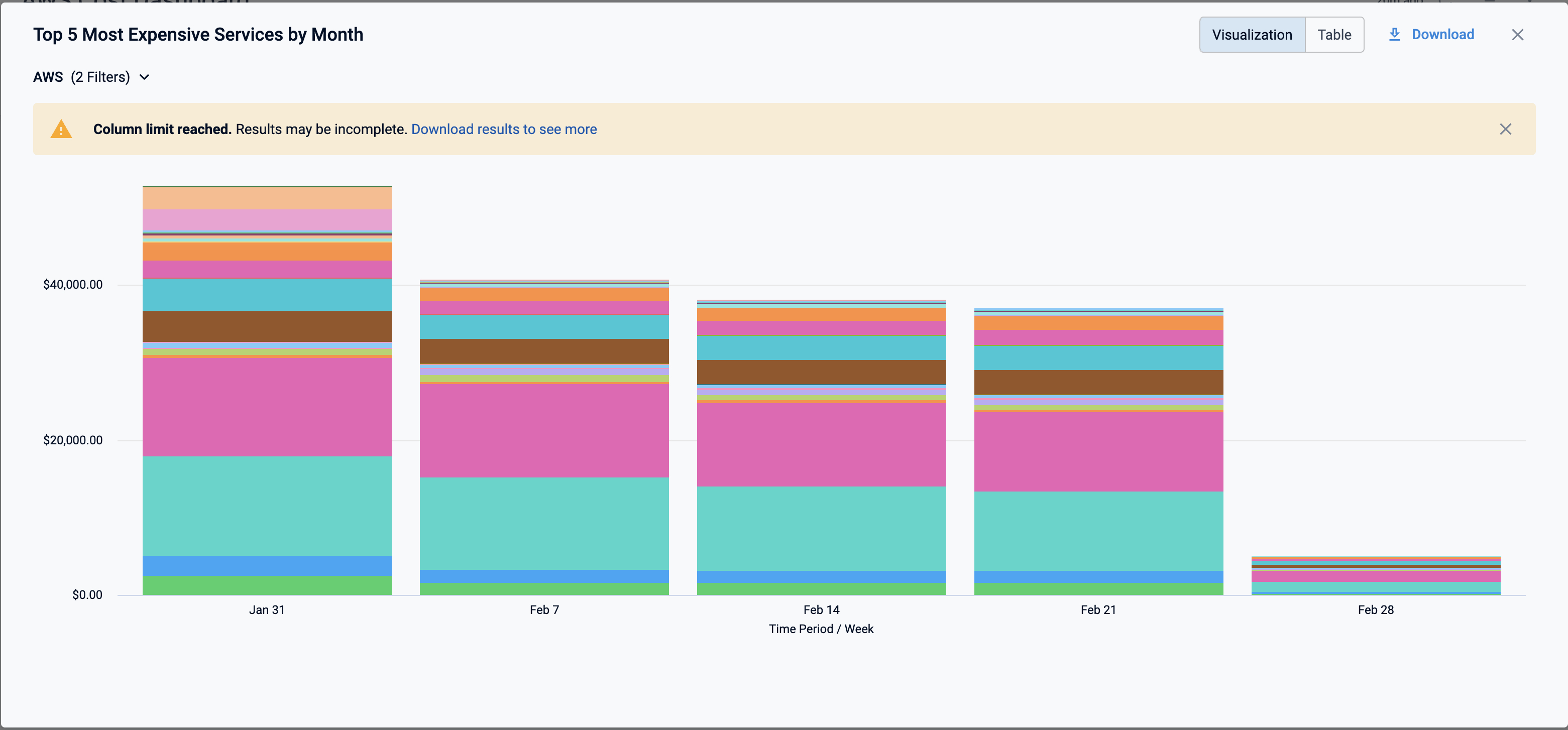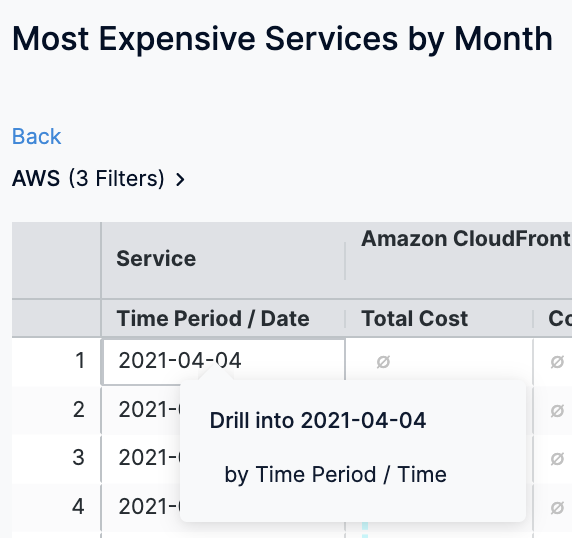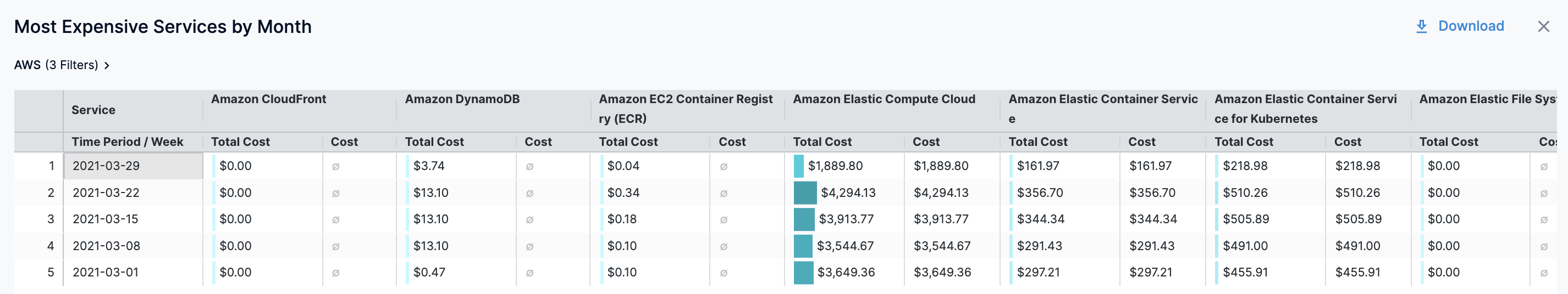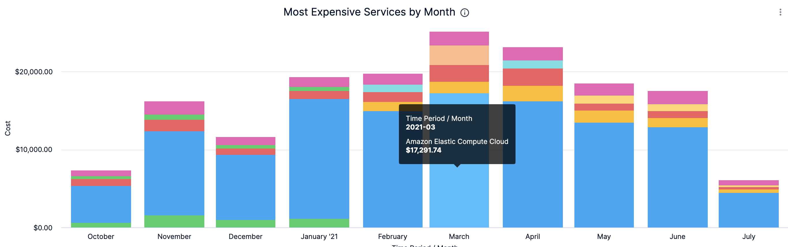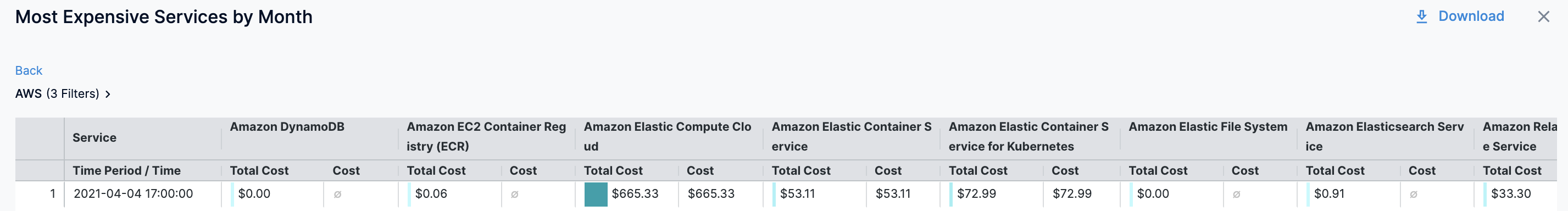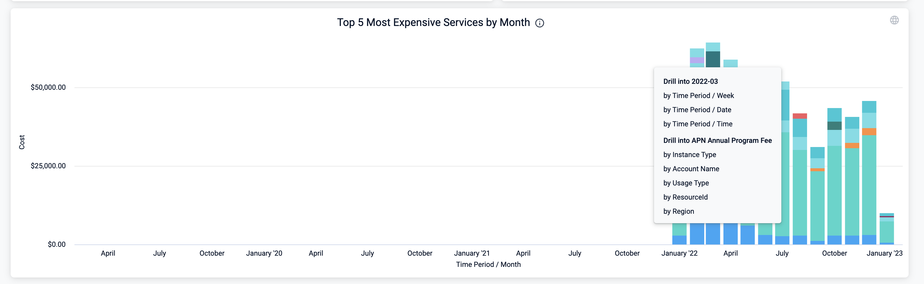 6. In Most Expensive Services by Month, click on the chart to further drill into the cost details: