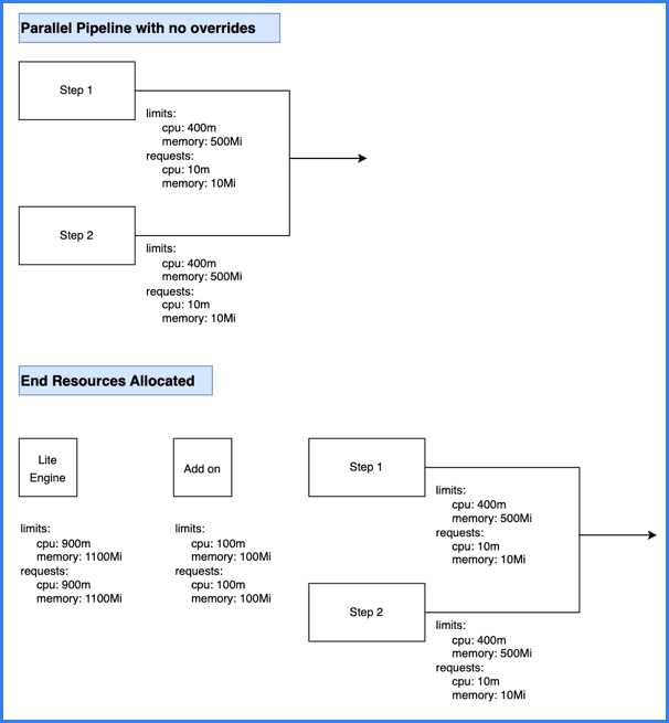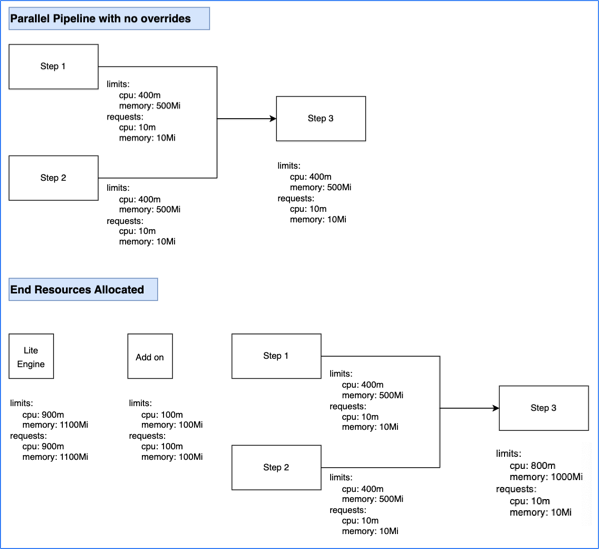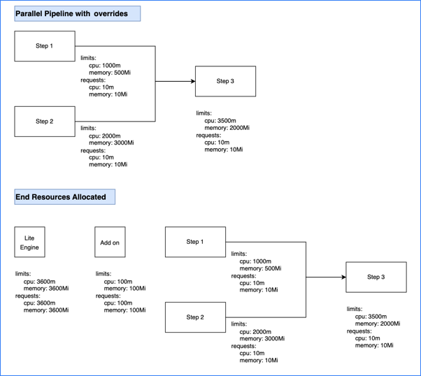 • The total stage (Lite Engine) resources for pipelines with both parallel and sequential steps is calculated as the total of the add on resources plus the greatest amount of resources needed for steps. The expanded calculation is as follows: