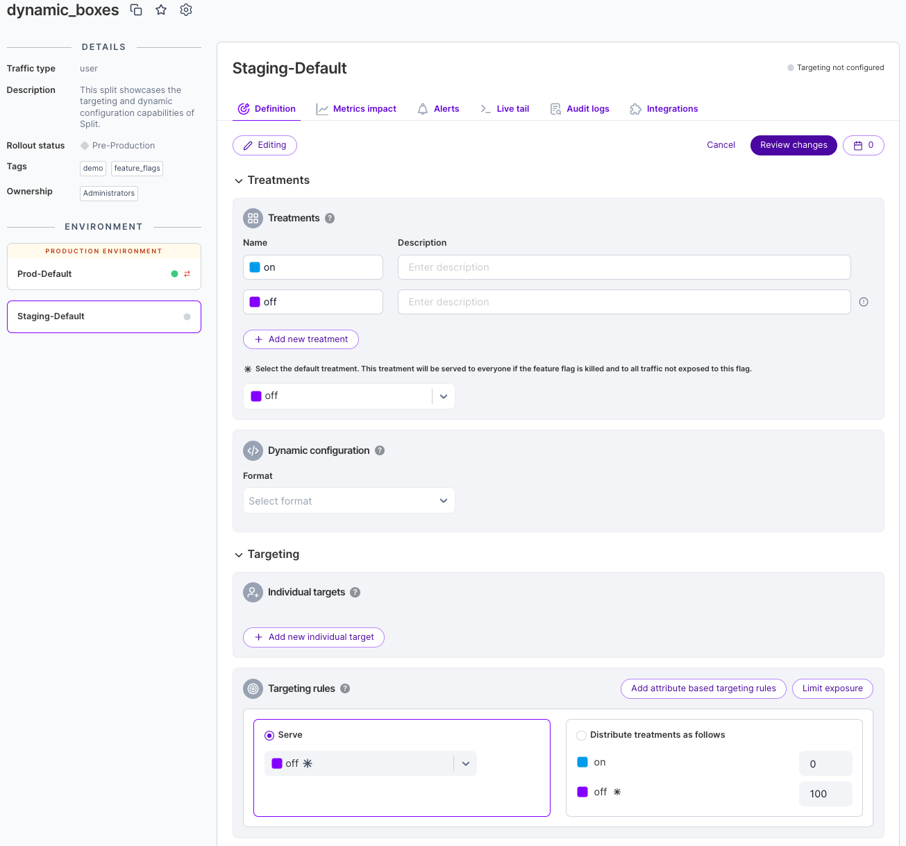 There are 3 primary objects in the platform: a feature flag is the main object, encompassing the definition of the feature flag, the rollout plan and where ongoing changes are managed.