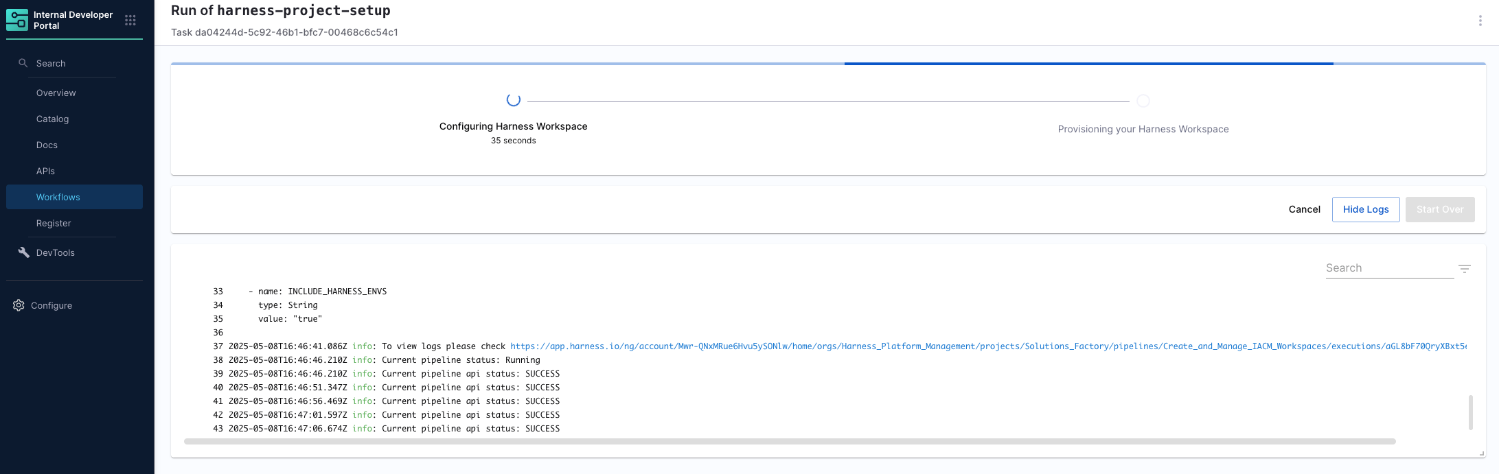 Scroll down to see another link that will direct you to the Create and Manage IACM Workspaces pipeline that is being run to start the workflow.