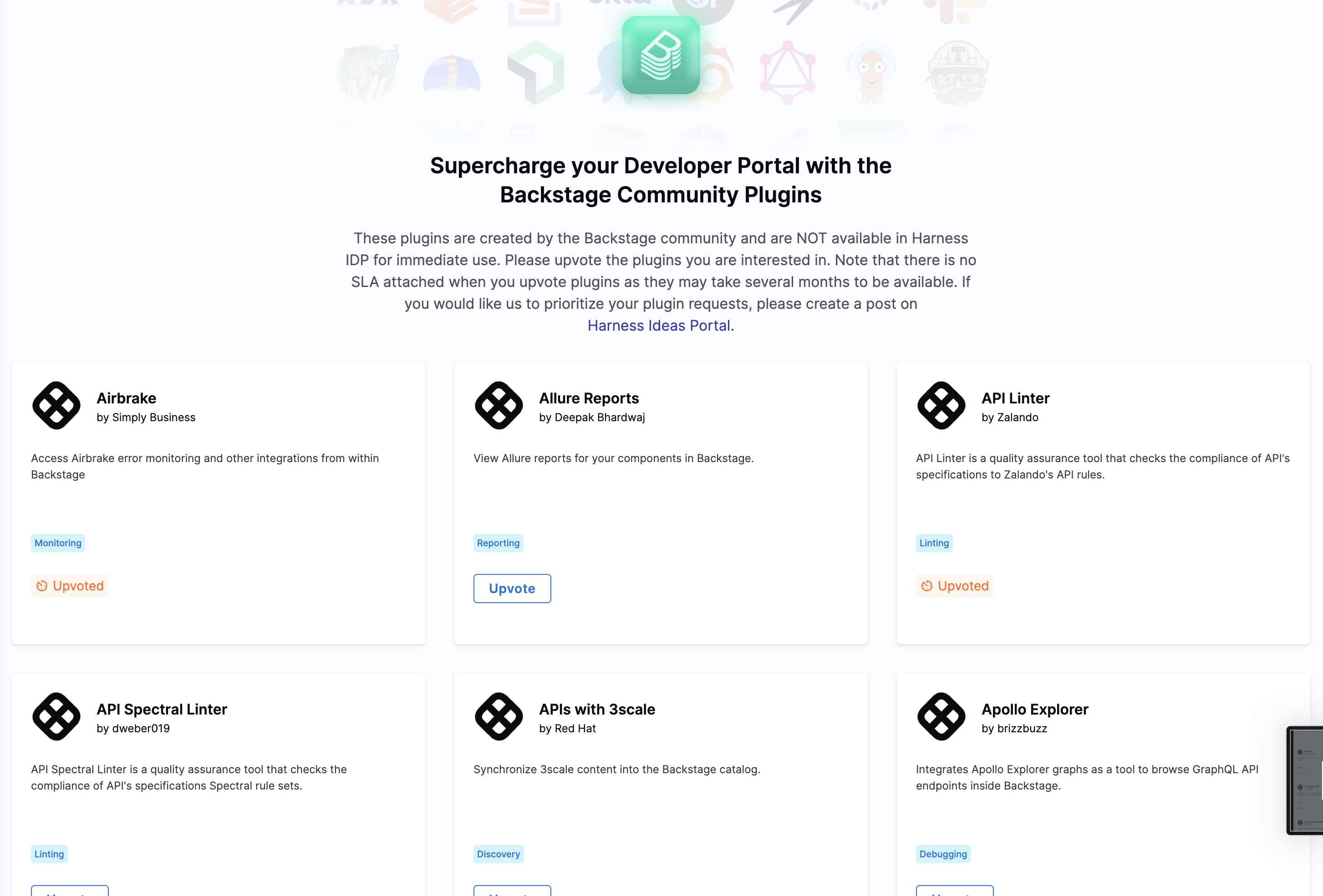 Harness plugins marketplace provides you a single pane of glass view of all the plugins that are available in Harness IDP, and the other available Backstage Community Plugins, that you can have support for in your Developer Portal.