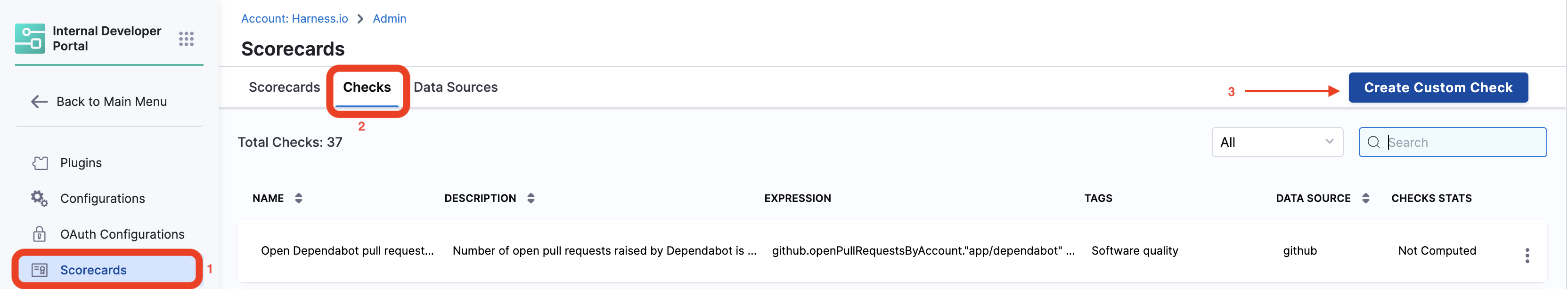 1. Under Admin section select Scorecards, now go to Checks tab and select Create Custom Check