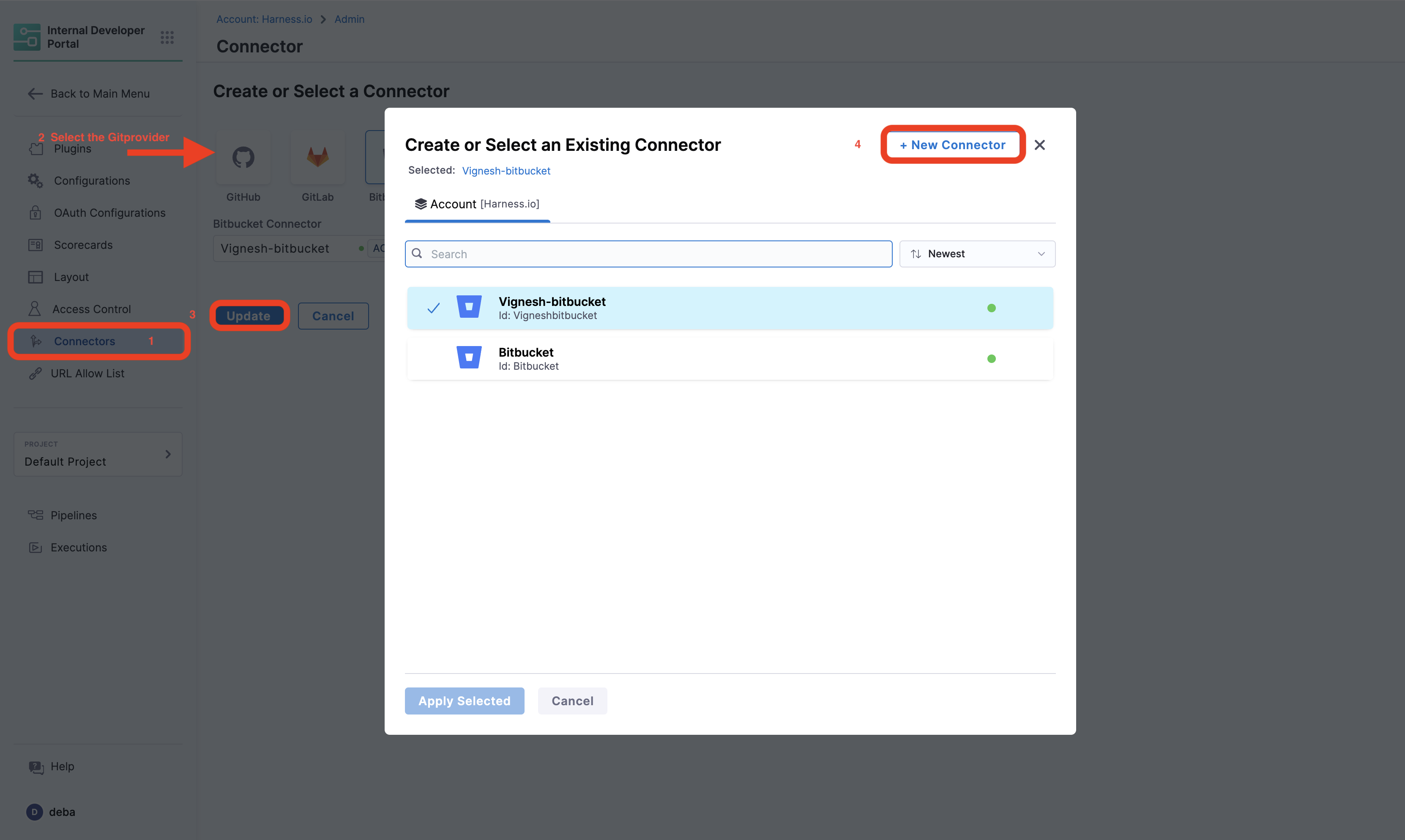 2. Access to your git provider through the connectors in the Admin section, remember to provide API access. Follow the steps mentioned here to create connector once you're in the connector window.