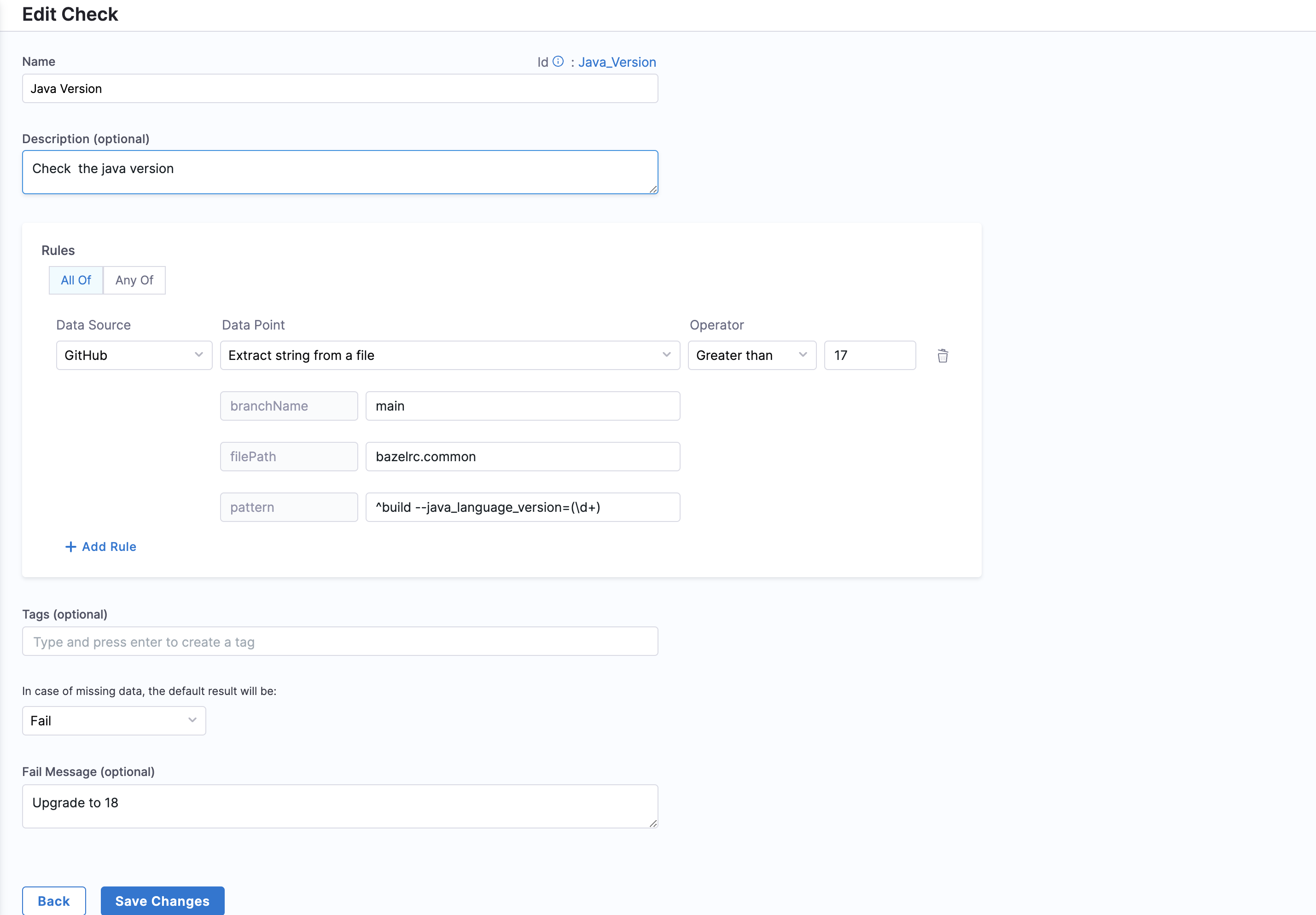 1. Since I'm trying to track to Java Version of my project using the bazelrc file which mentions my java version as build --java_language_version=17 and the corresponding Regex Pattern to be used for the same is ^build --java_language_version=(\d+)