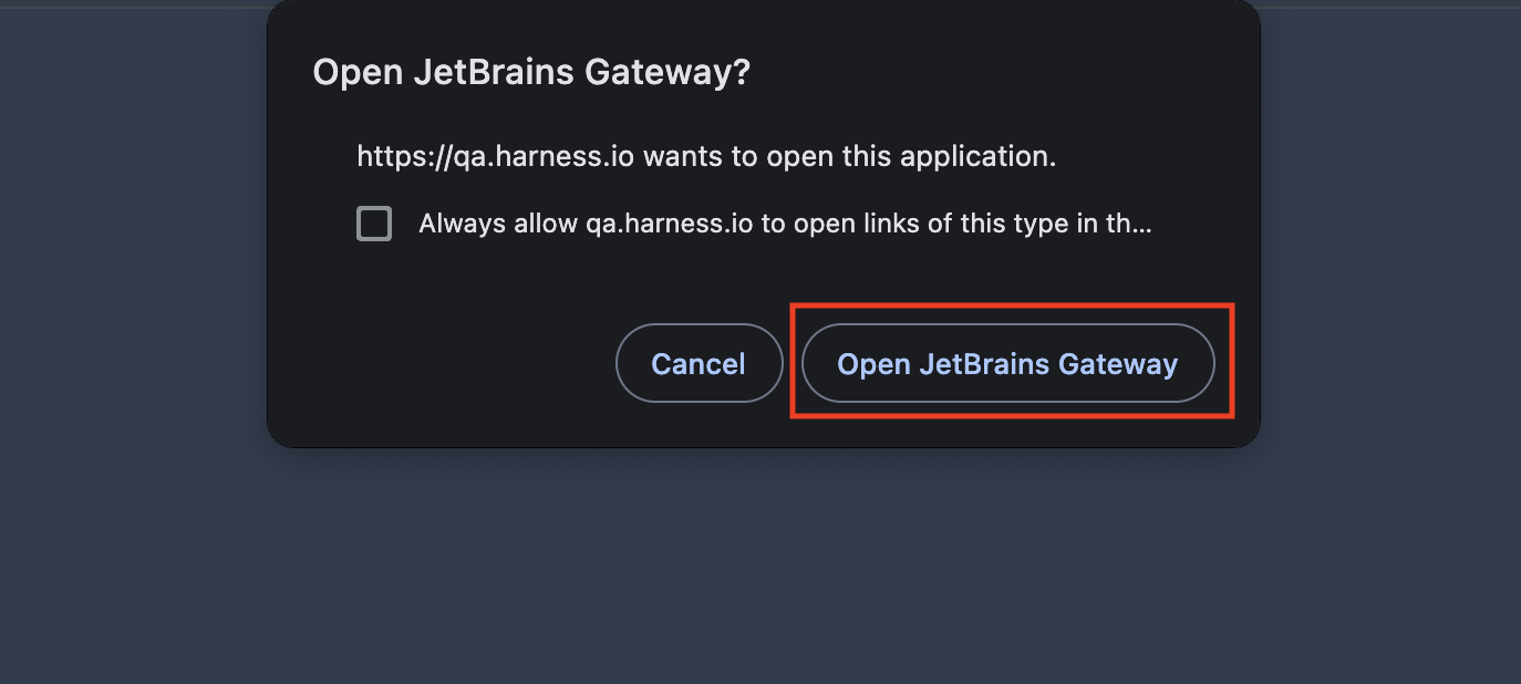 2. A prompt will appear requesting permission to open JetBrains Gateway and establish a connection with the remote server. Click "Open JetBrains Gateway".