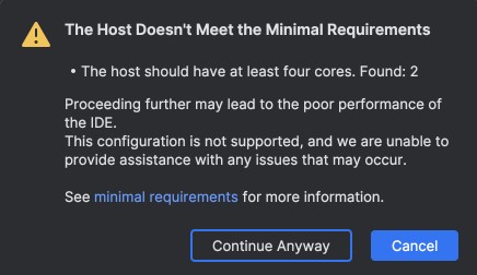 If your Gitspace does not meet the recommended requirements, the following warning may appear during your IntelliJ setup. You can choose to create a new Gitspace that adheres to the recommended specifications or proceed with your existing configuration.