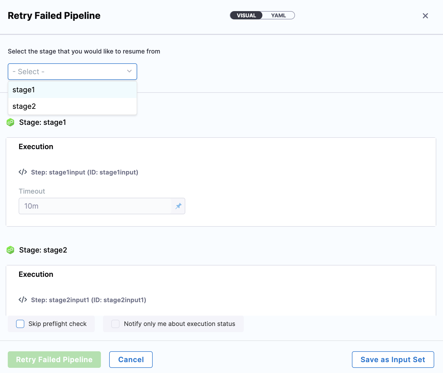 3. In the Retry Pipeline settings, select the stage from which you want to retry the Pipeline. If your pipeline uses runtime inputs, these are automatically populated from the previous execution.