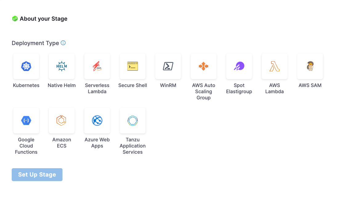 Select the type of deployment this stage must perform. For this example, select Kubernetes. The deployment type is how your service will be deployed. For example, using Kubernetes, Native Helm, Serverless, etc. Select the platform for your deployment. When you select a platform, its specific settings open.