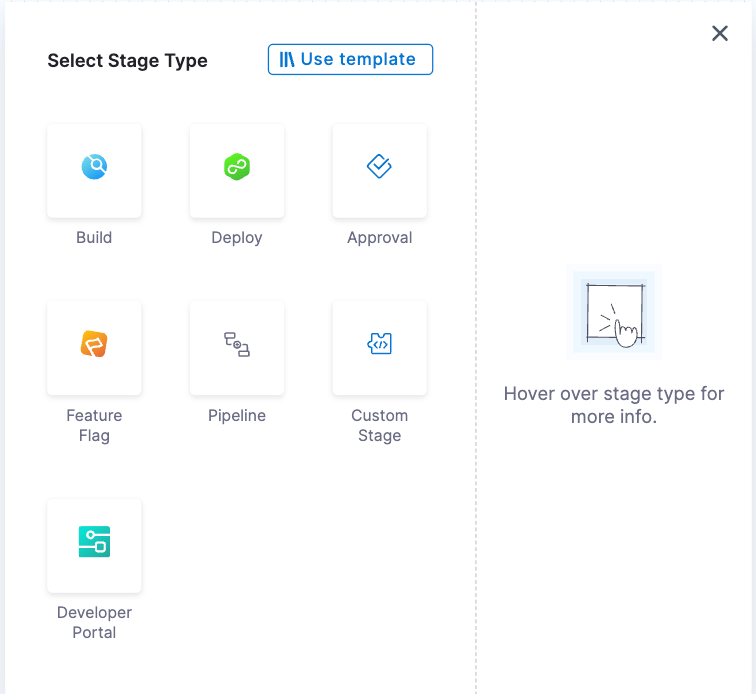In Harness, open the pipeline, and then select Add Stage. The Select Stage Type settings open.