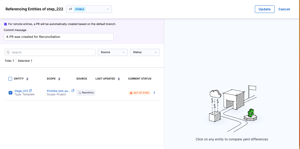 When you update a child entity, the step template and the parent entities, i.e., stage and pipeline templates must be updated as well. In this scenario, the concept of reconciliation comes into play.