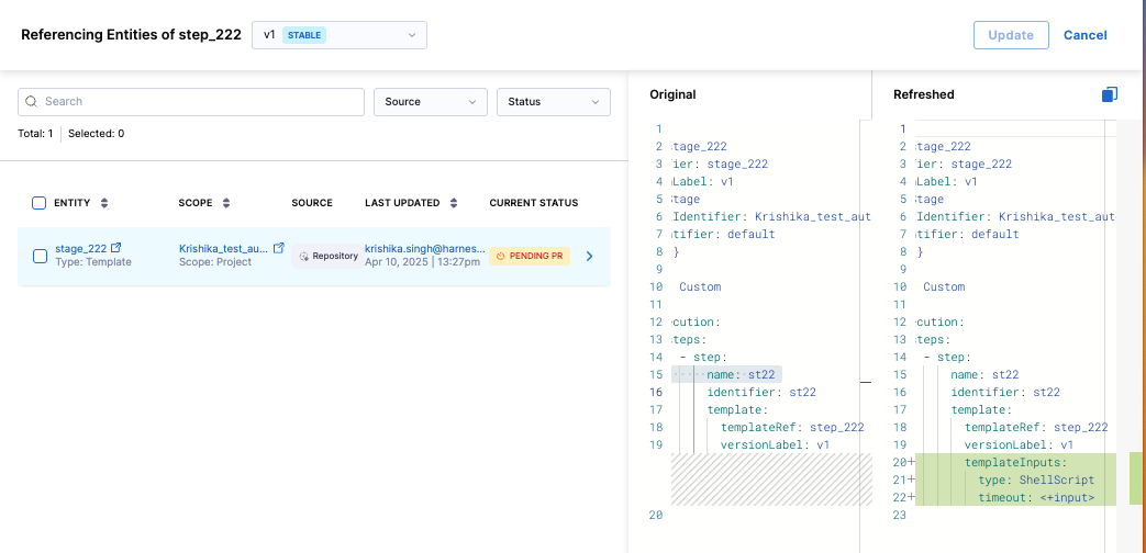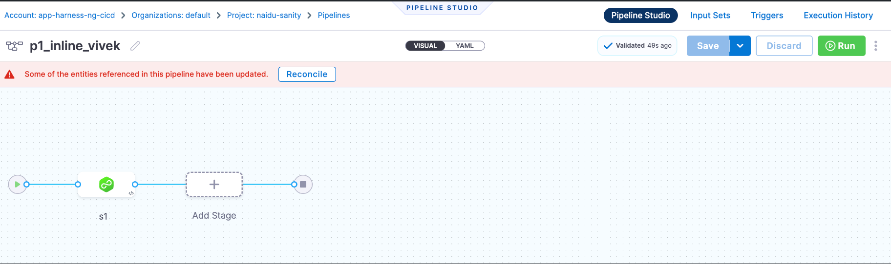 If any entity referenced in a pipeline is updated, Harness prompts you to update the pipeline if you're viewing the pipeline in Pipeline Studio. Harness detects updates made to the referenced entities using Pipeline Studio or YAML view.