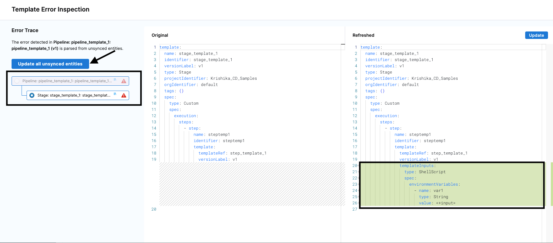 First, you will be asked to update the stage template, and then the pipeline template. You also have the option to Update all unsynced entities at once.