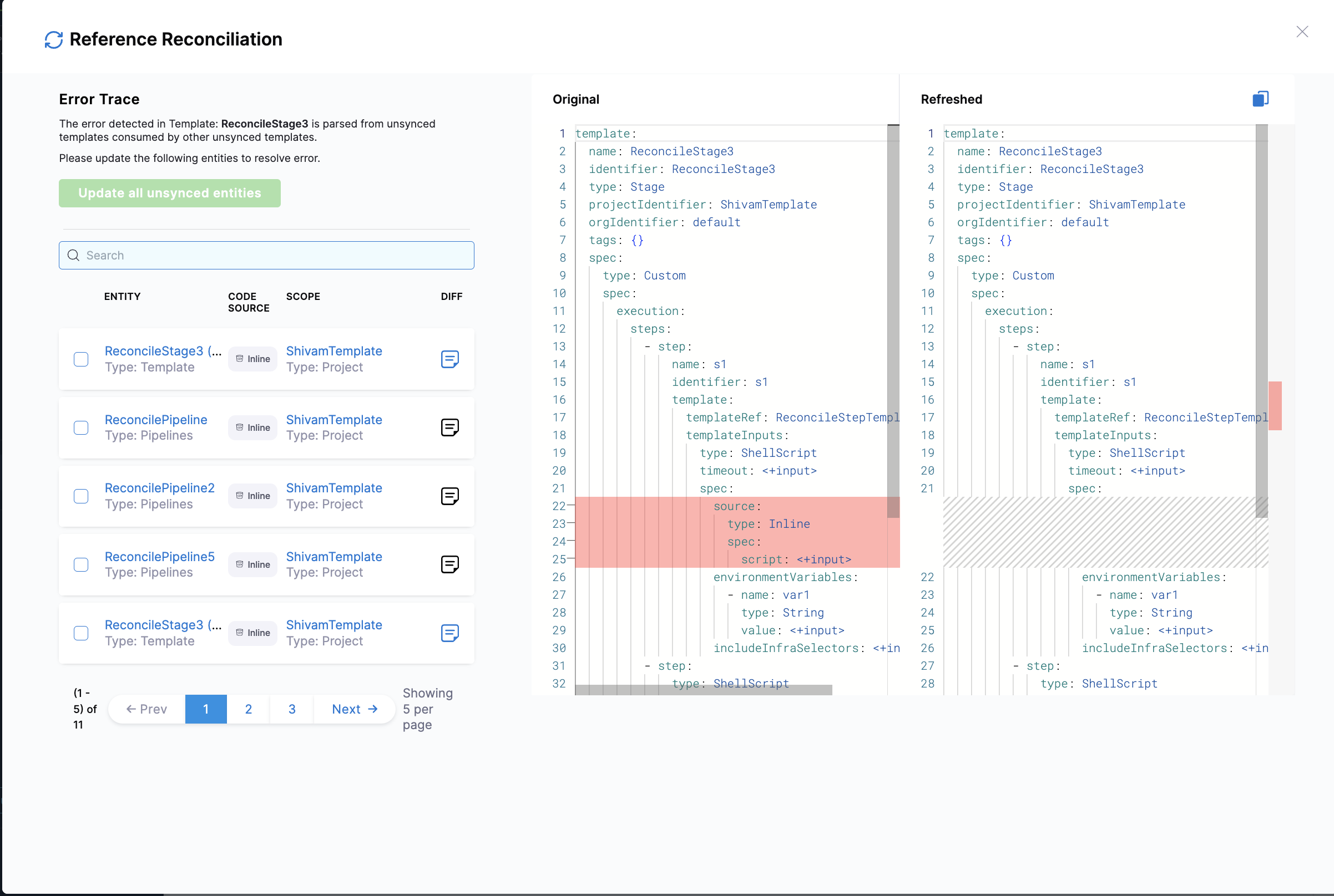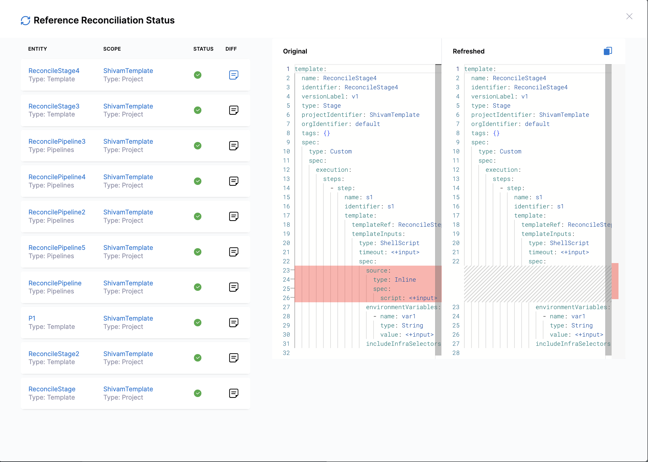 When reconciling a pipeline, Harness shows you the diff between the current YAML configuration and the updated YAML configuration.