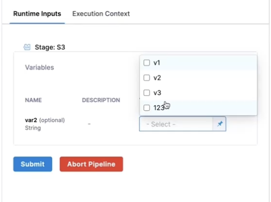• Select mid-run input from a list of allowed values: <+input>.allowedValues(value1,value2).executionInput()