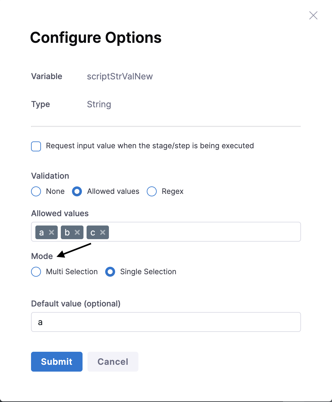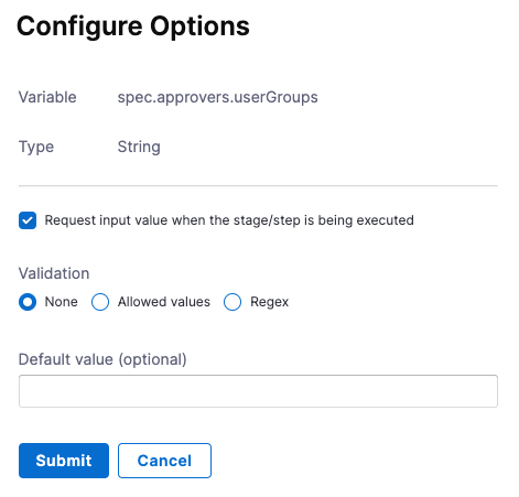 • Provide a default value and provide a list of allowed values for mid-run input: <+input>.allowedValues(value1,value2).default(value1).executionInput()