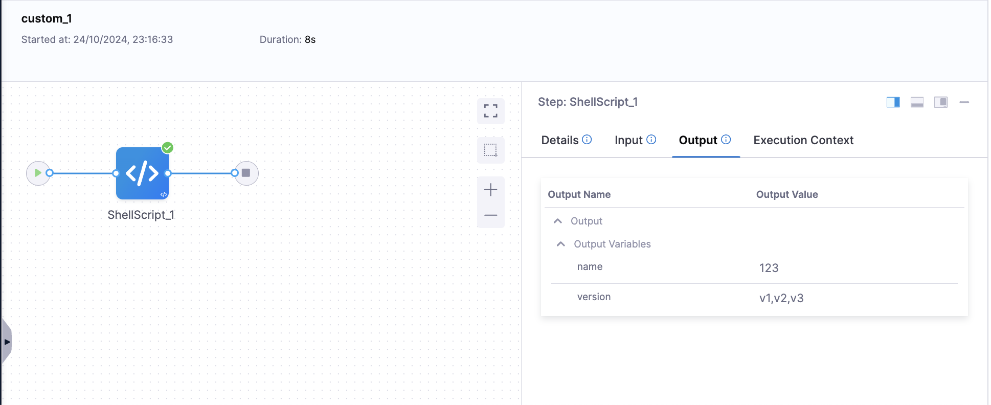 Now, when we execute the pipeline, the first stage (custom_1) will run, and the script's output variables, name and version, will resolve to their respective values.