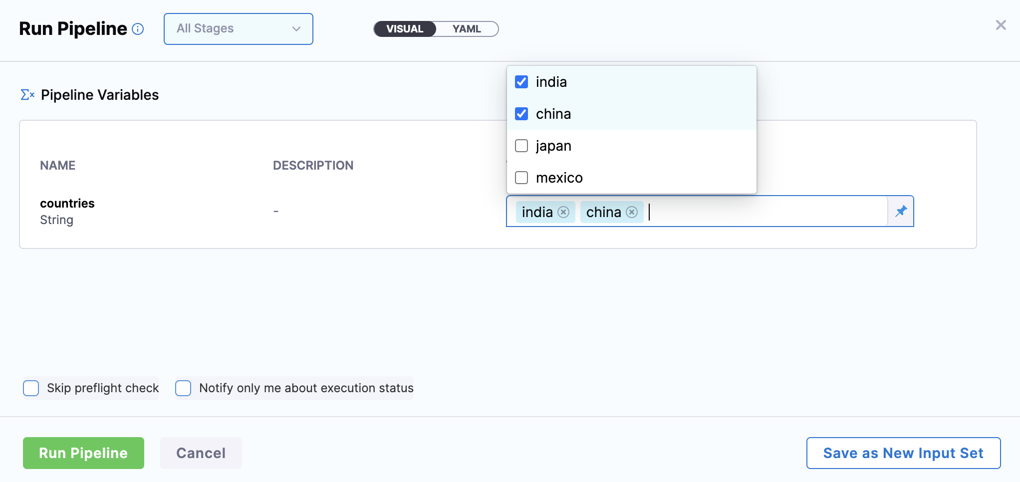 You can use Multi Selection if you want to choose one or more values from the list of allowed values. Multi Selection by default maps to the .selectManyFrom() functor and Single Selection maps to the .selectOneFrom() functor. You can use multiple selection for runtime inputs in pipelines, stages, and shell script variables only. You must specify multiple allowed values to use it.