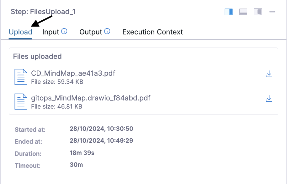 To get the exact uploaded file name, navigate to the Output tab of the upload step execution, where the full file name can be found.