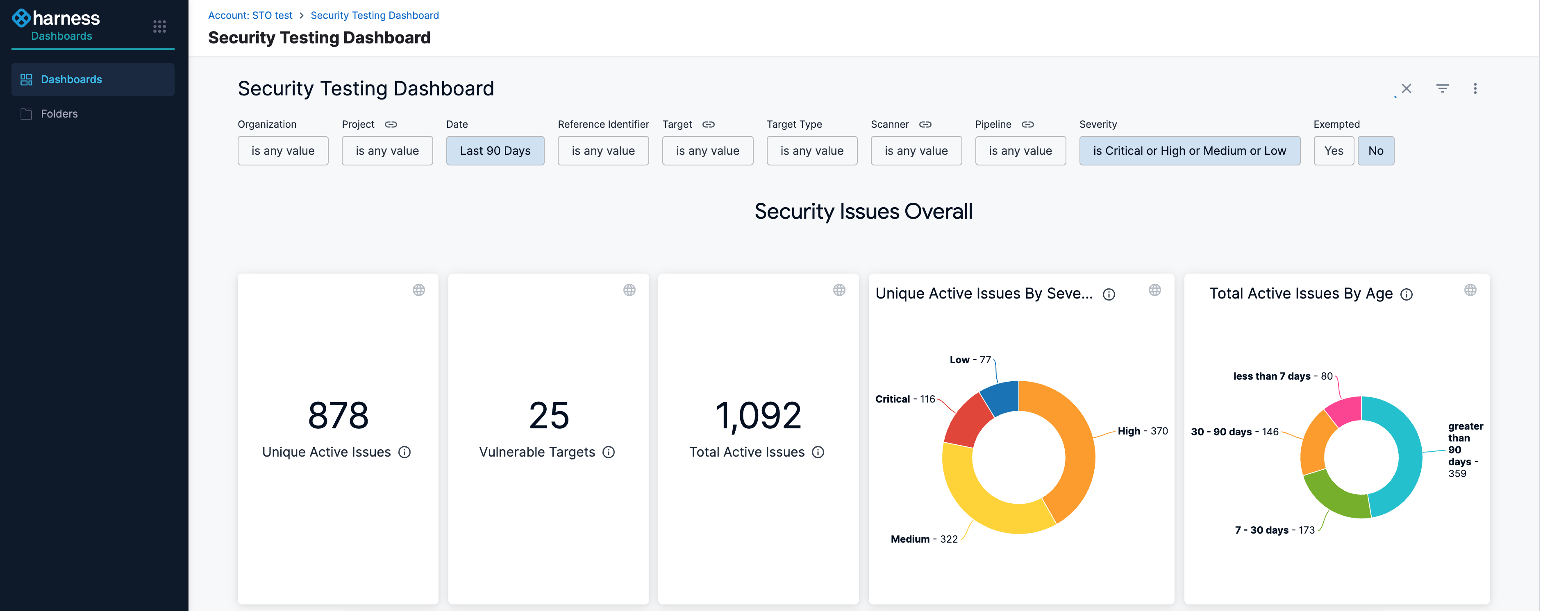 The Security Testing Dashboard provides an overview of security issues identified across the account. It includes filters that help narrow down data by Organization, Project, creation date, scanner, target, pipeline, severity, and more. The dashboard components are interactive. You can hover over charts, graphs, and other visual elements to view tooltips with additional context. Clicking on a component lets you drill down into related data or navigate to specific detail pages within STO for deeper investigation. For steps to navigate to this dashboard, refer to View STO dashboards.