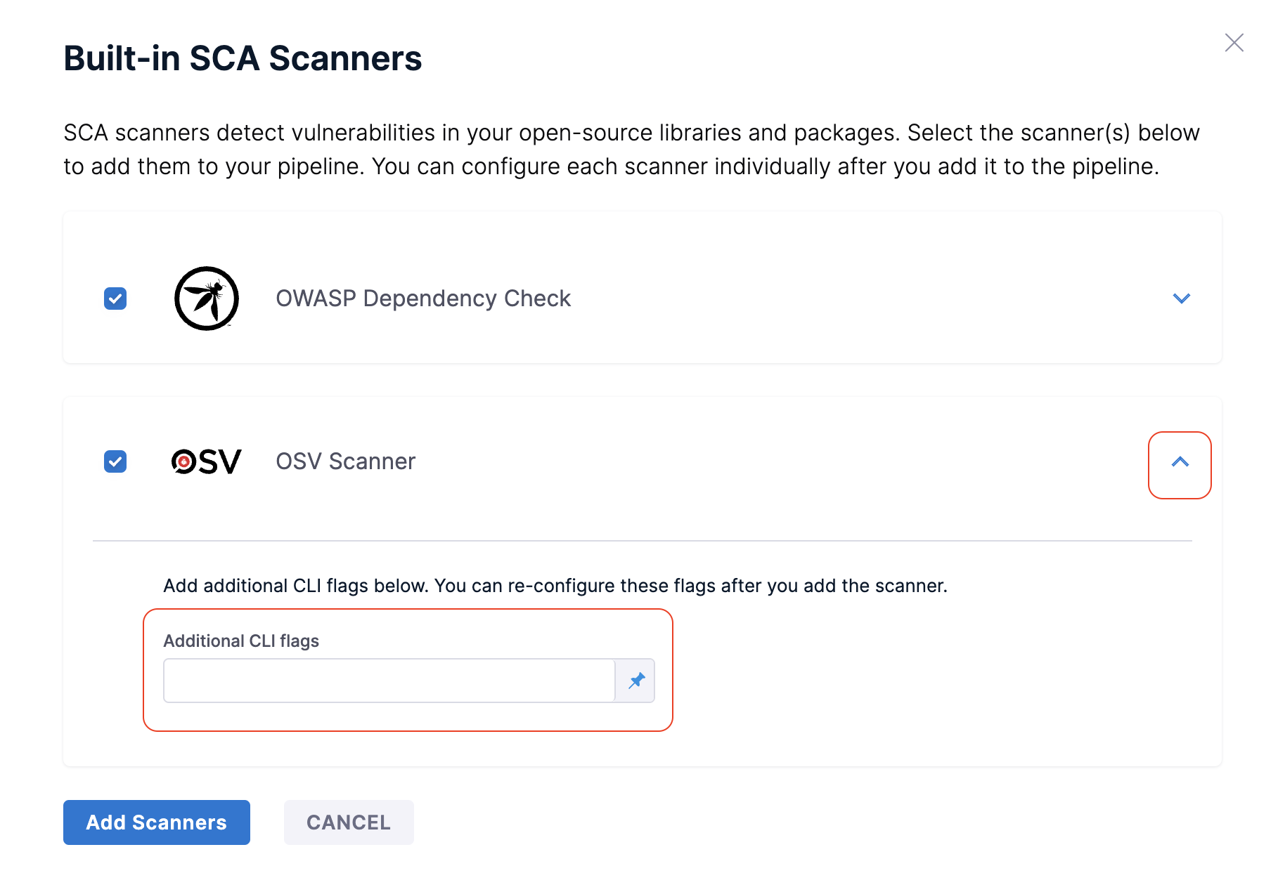 Once selected, you will view a list of supported scanners available for the selected scan type. Depending on the scan type and scanner availability, you may see one or multiple step options to select. Optionally, expand the scan step to pass any Additional CLI Flags if required.