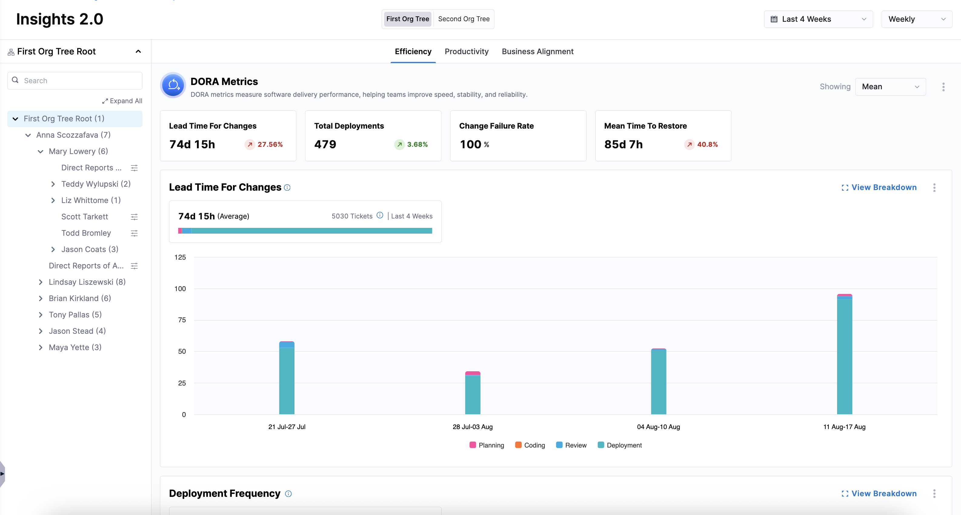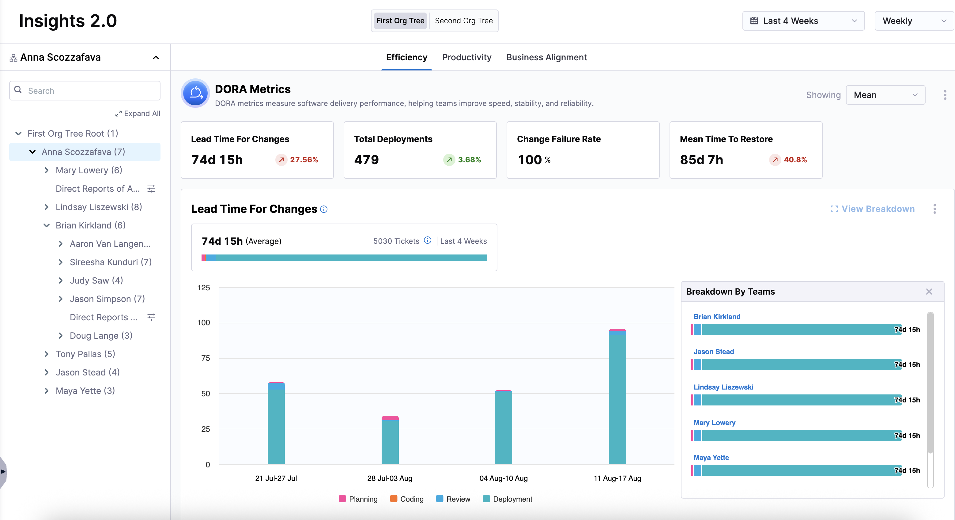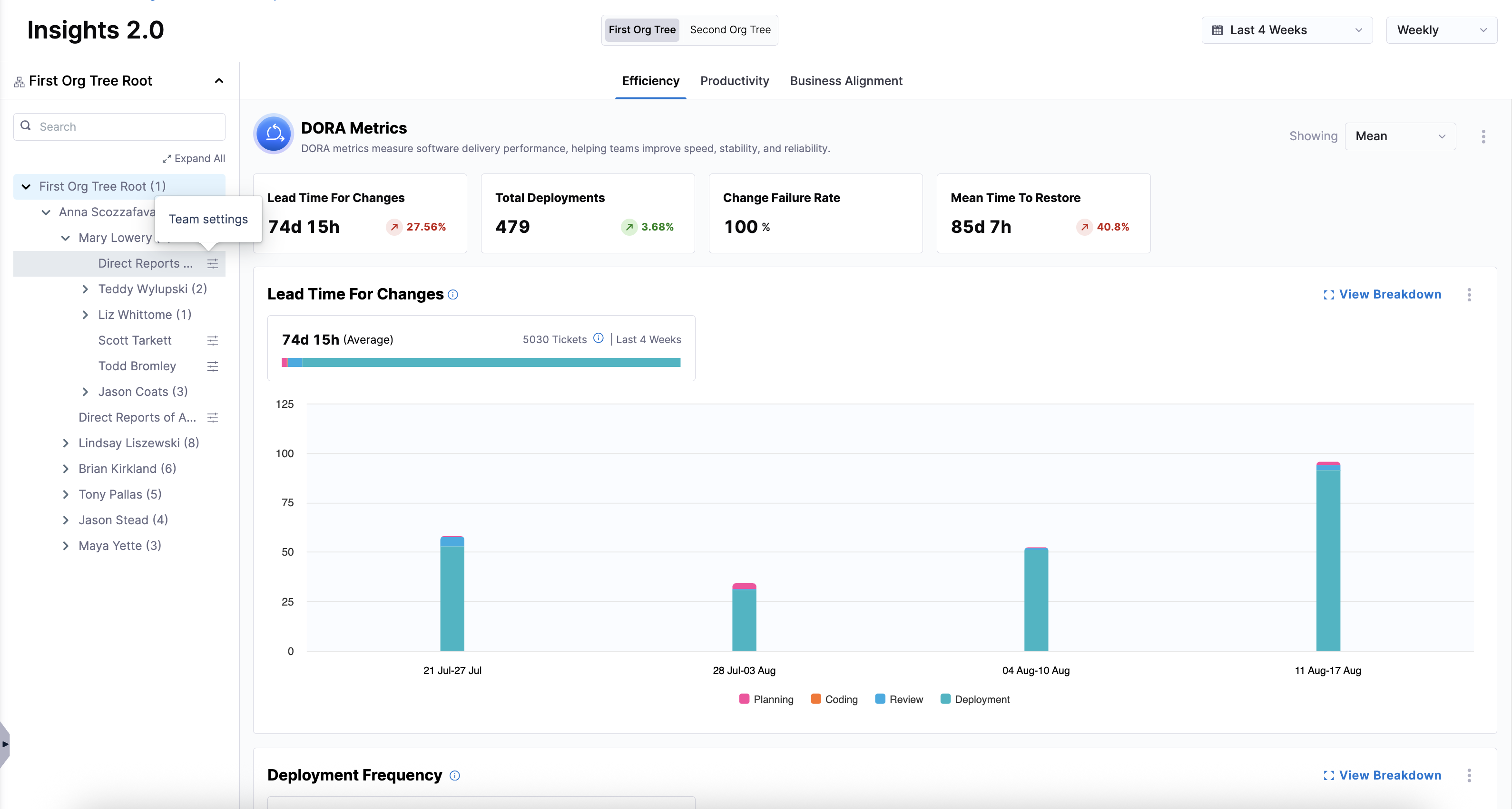 Once you've set up integrations, created profiles, uploaded your developer records, and created an Org Tree, you can view high-level insights on Efficiency, Productivity, and Business Alignment. To get more granular insights, drill down into specific teams within an Org Tree and apply team-specific settings.
