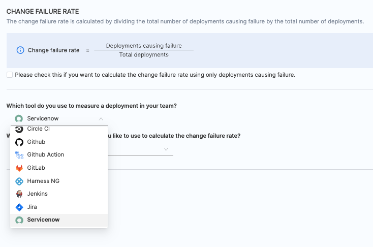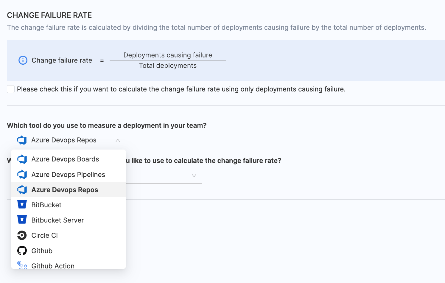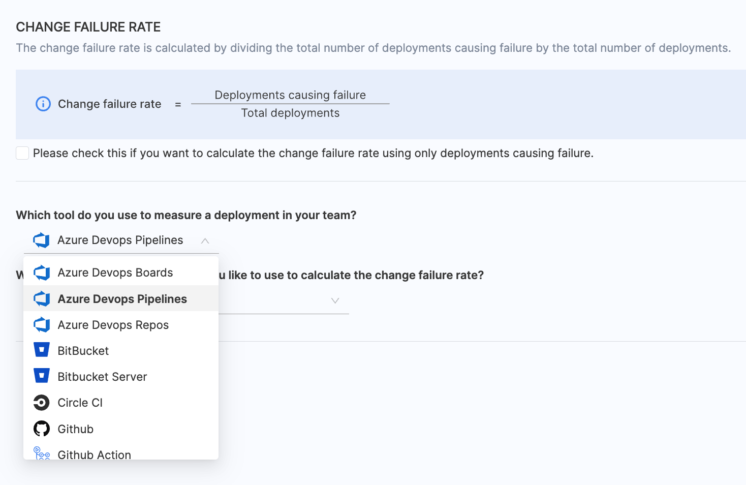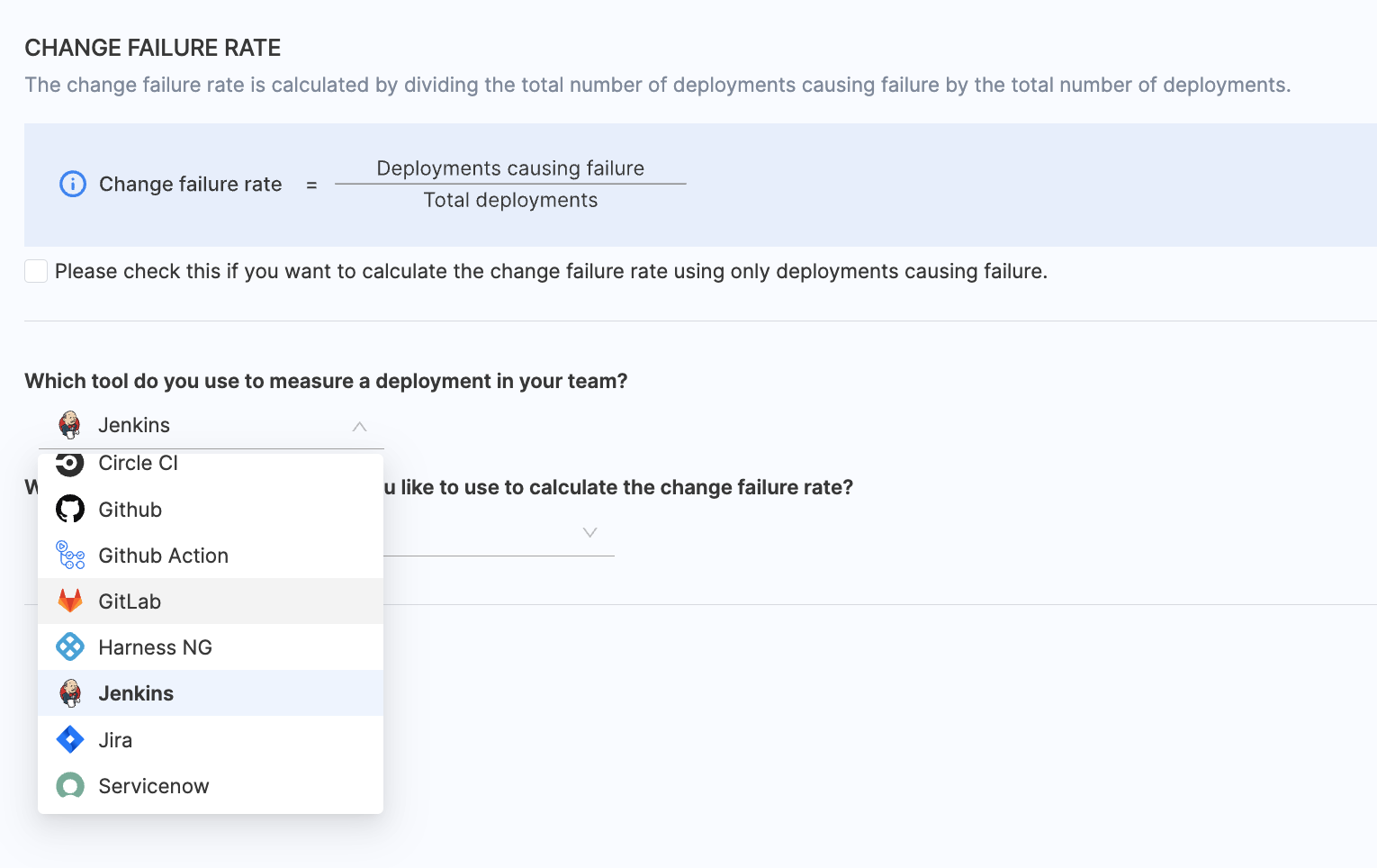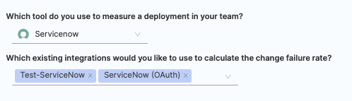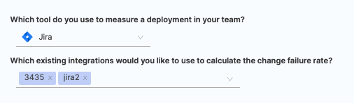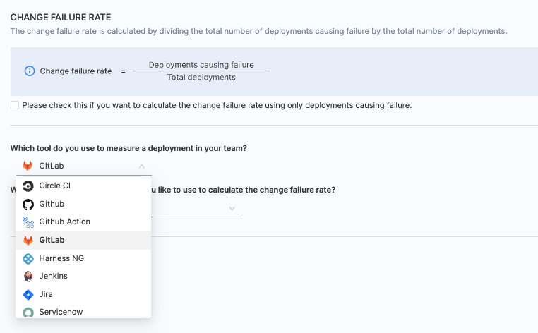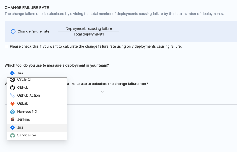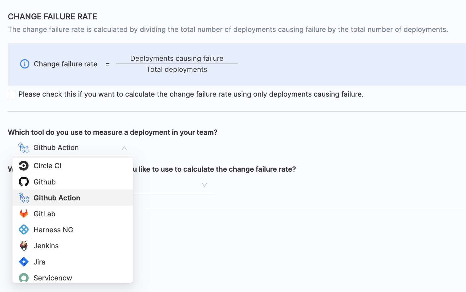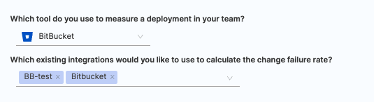 • Choose any existing integrations you want to utilize for calculating the change failure rate.