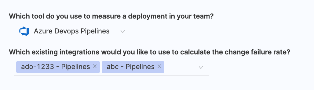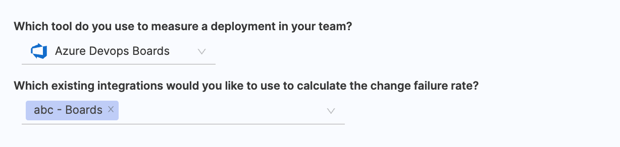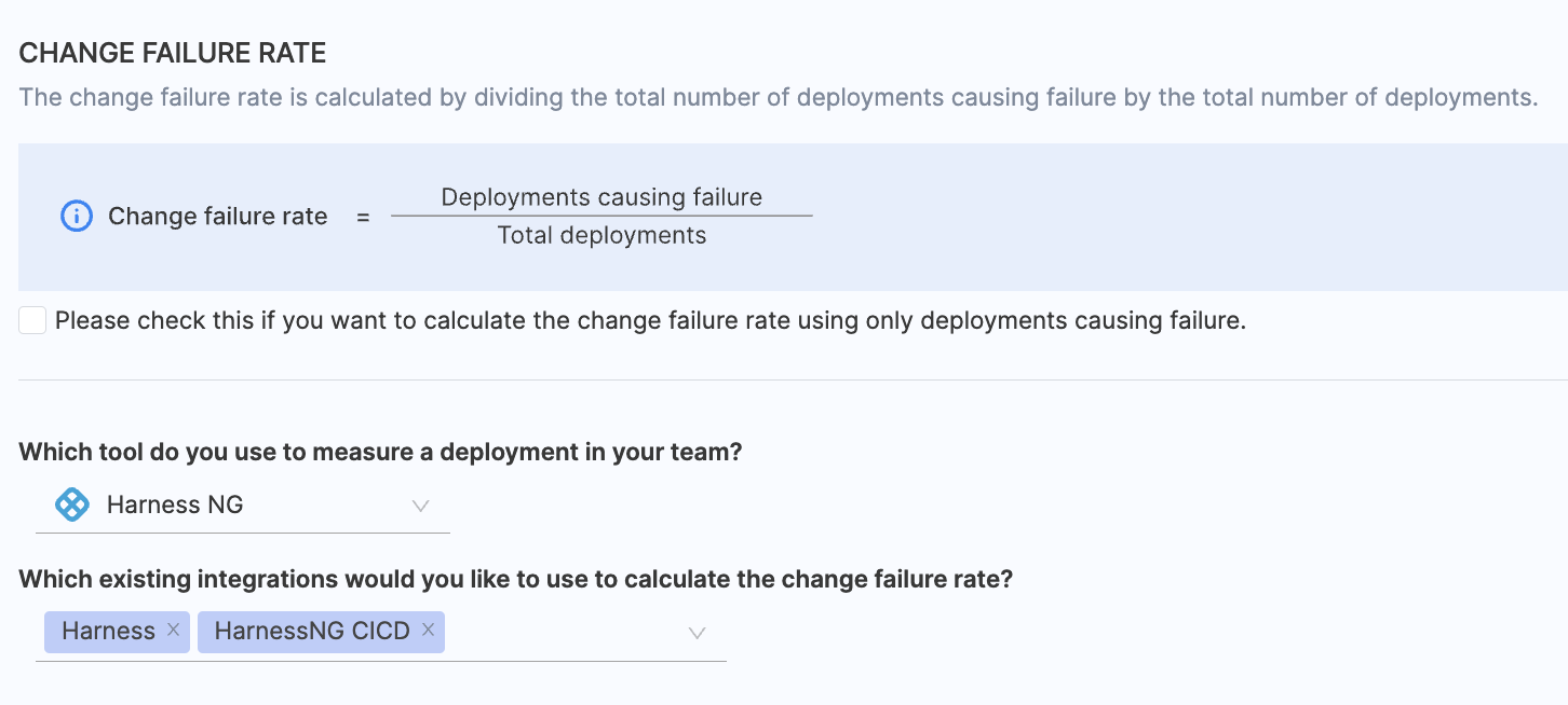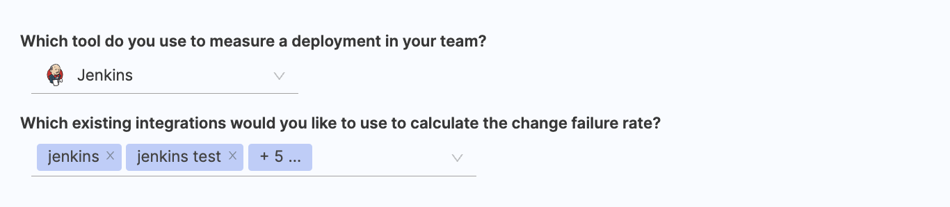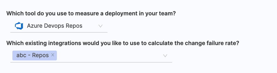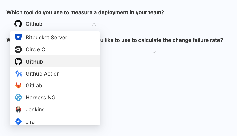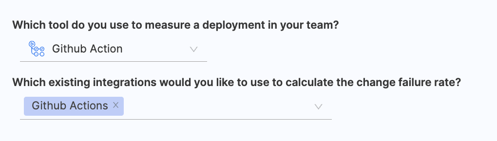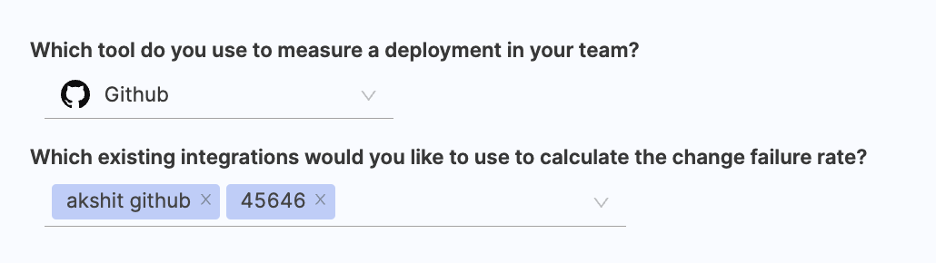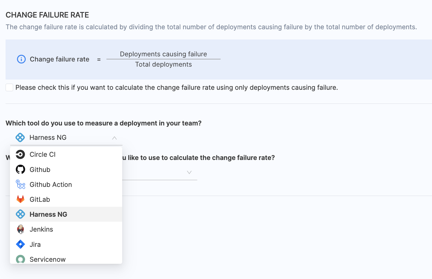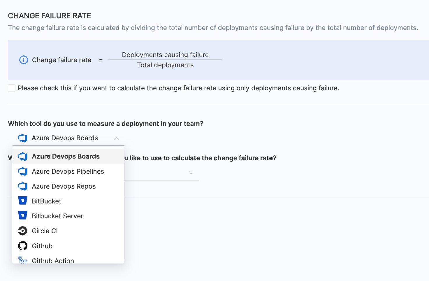 • Choose any existing integrations you want to utilize for calculating the change failure rate.