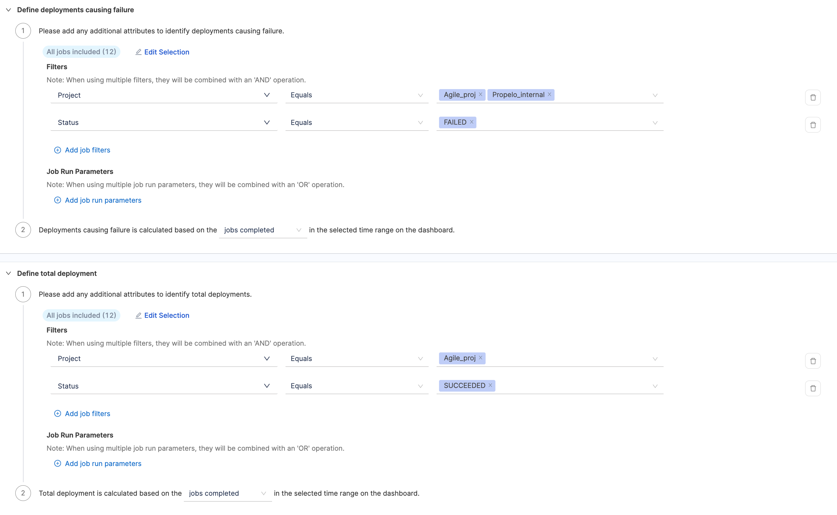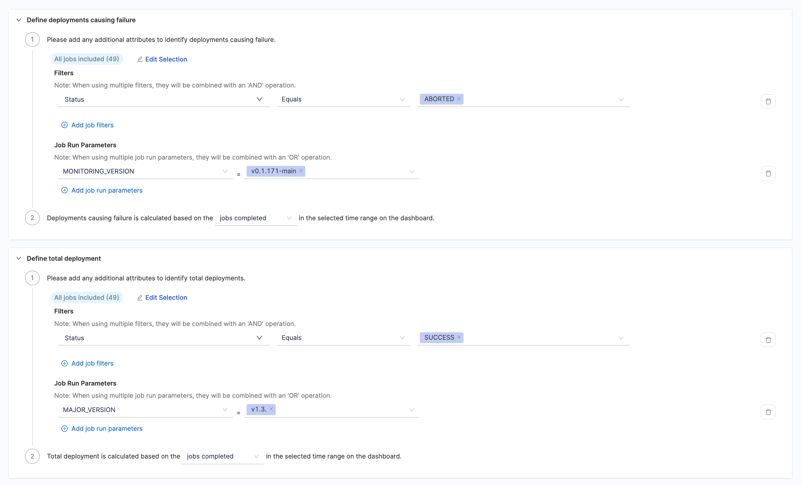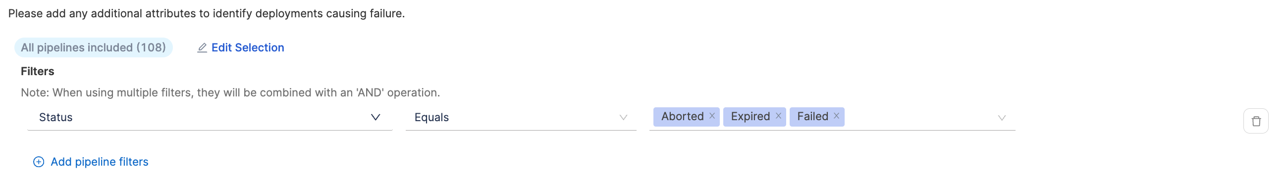• Configure additional attributes to identify deployments that result in failure. By default, all pipelines are included, but you can customize the selection by manually specifying which pipelines should be included.
