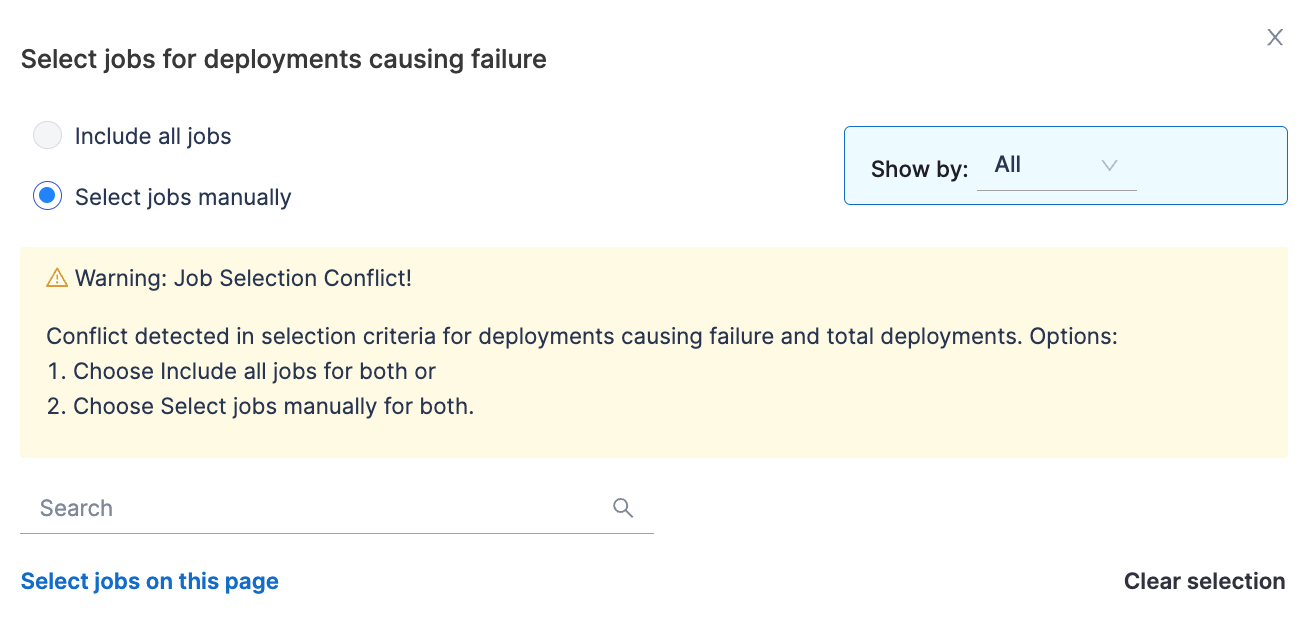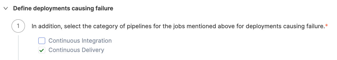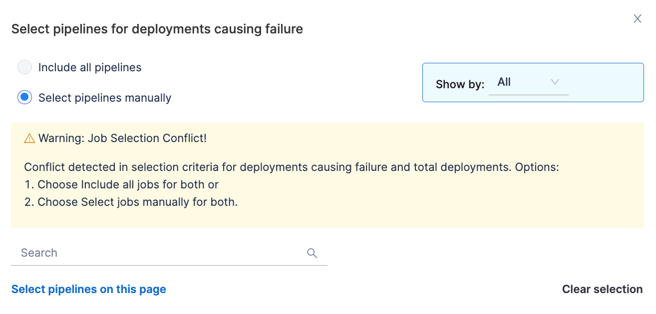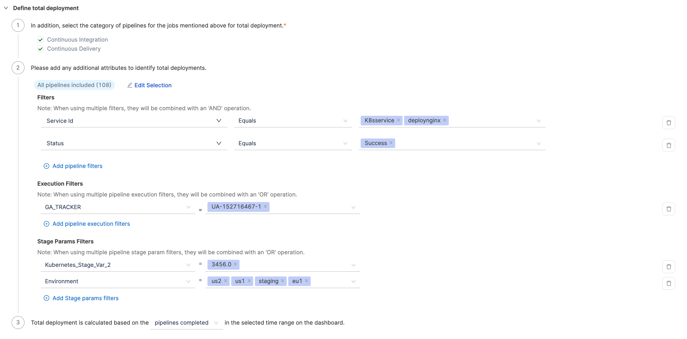• Configure additional attributes to identify deployments that result in failure. By default, all pipelines are included, but you can customize the selection by manually specifying which pipelines should be included.