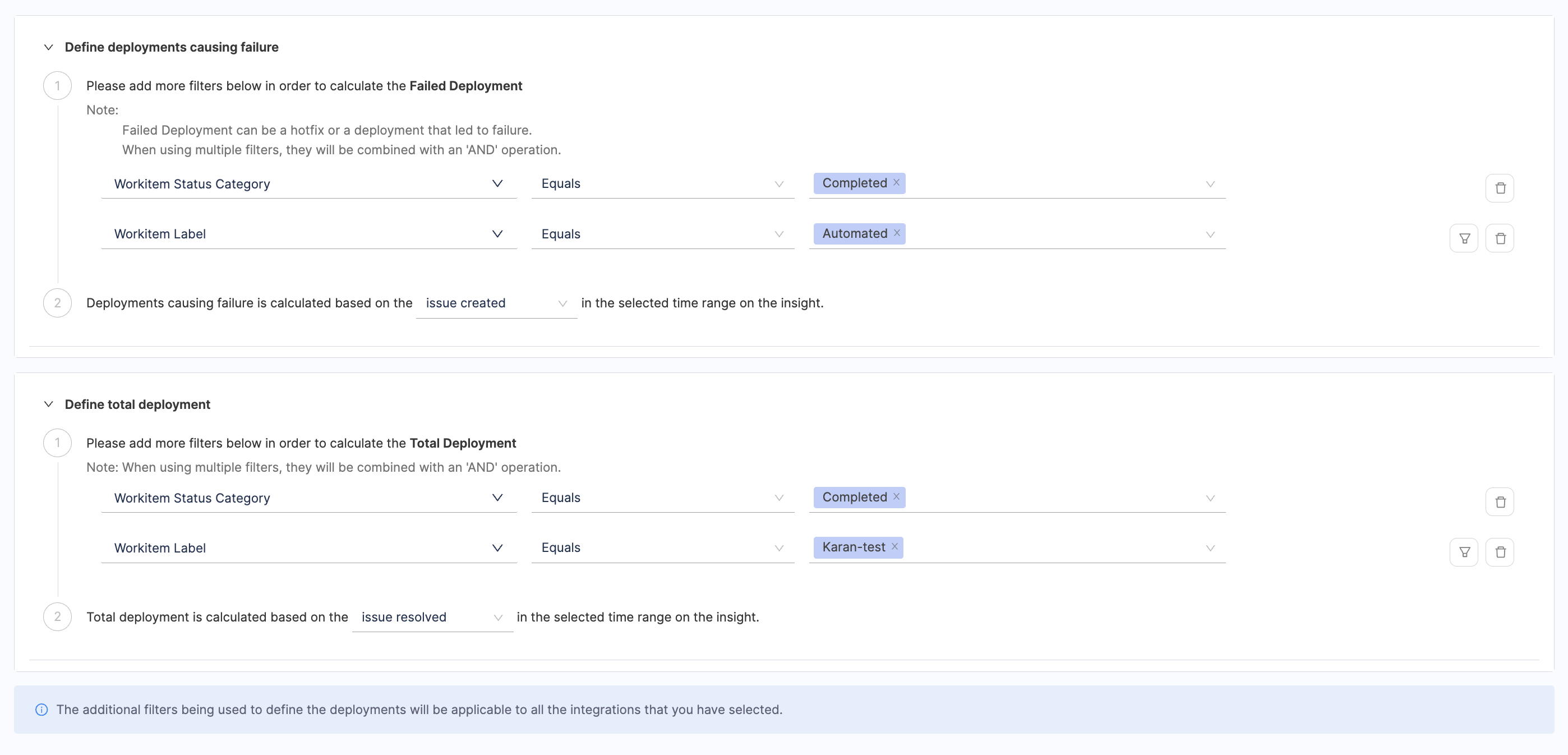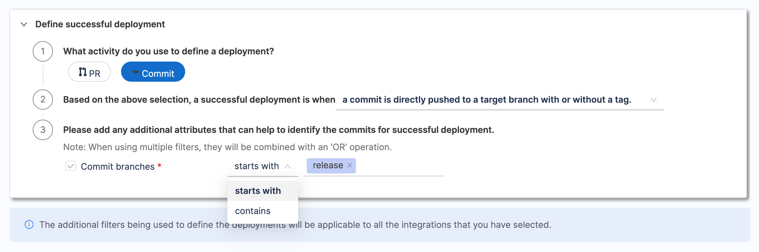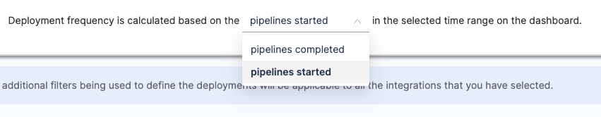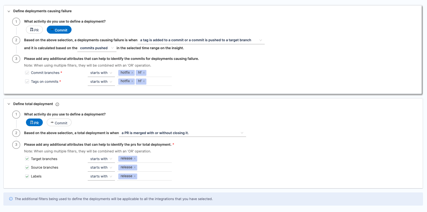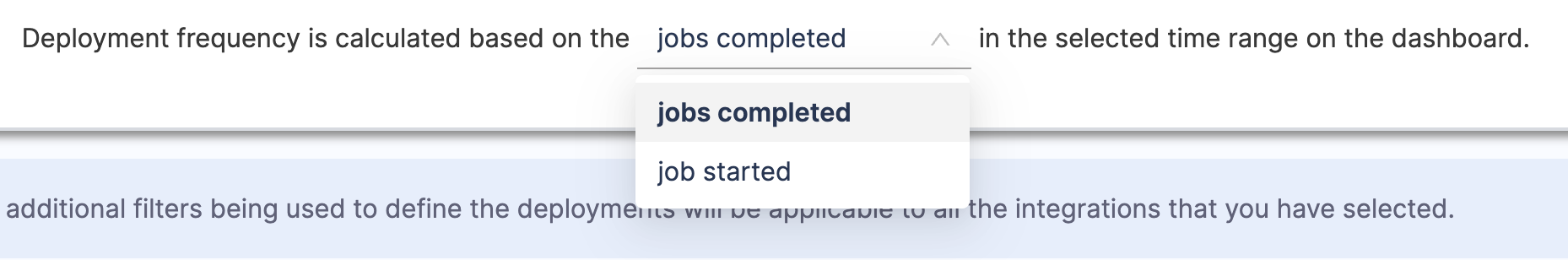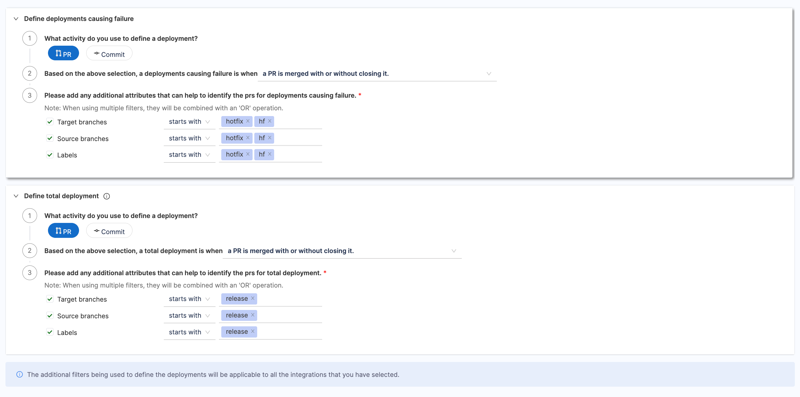 • Defind the settings for how you want to calculate deployment frequency. The additional filters being used to define the deployments will be applicable to all the integrations that you selected.