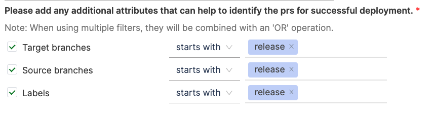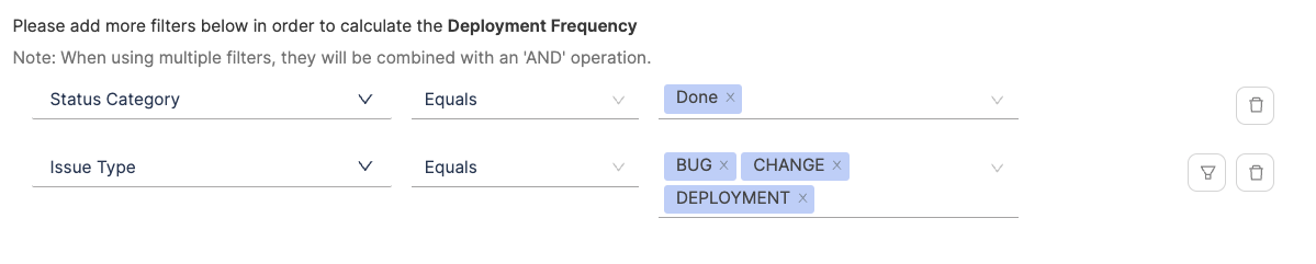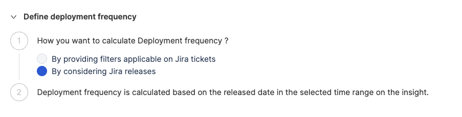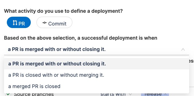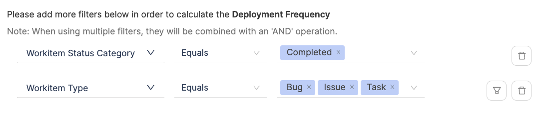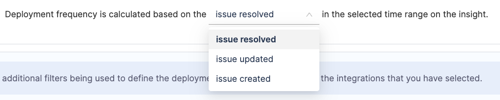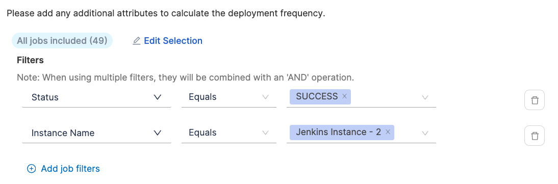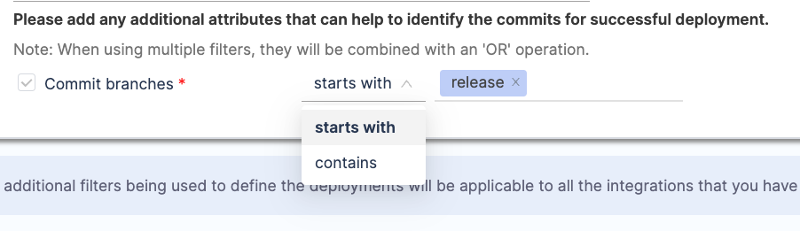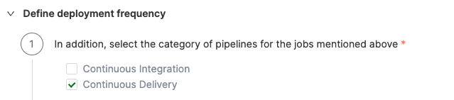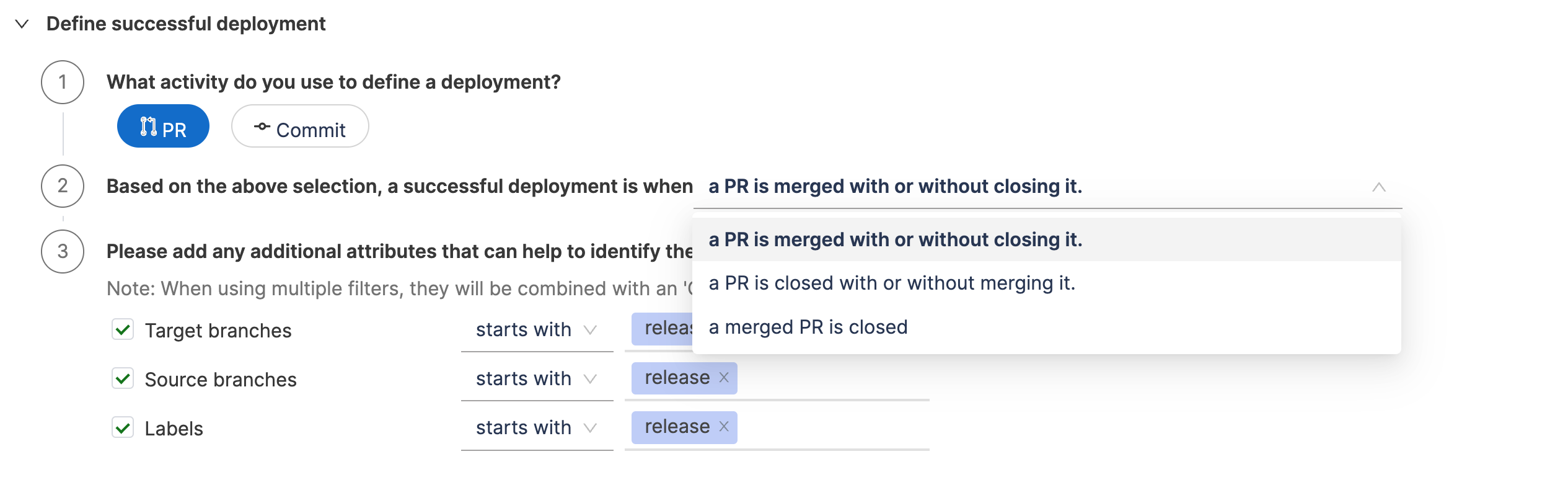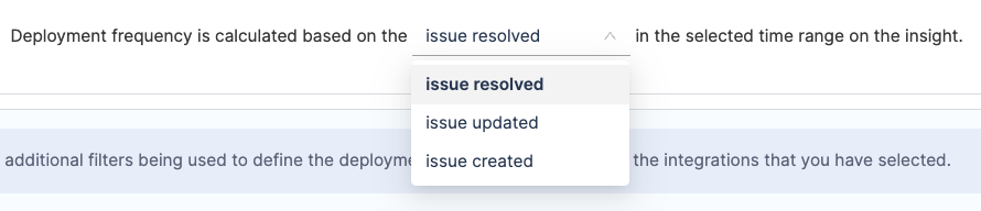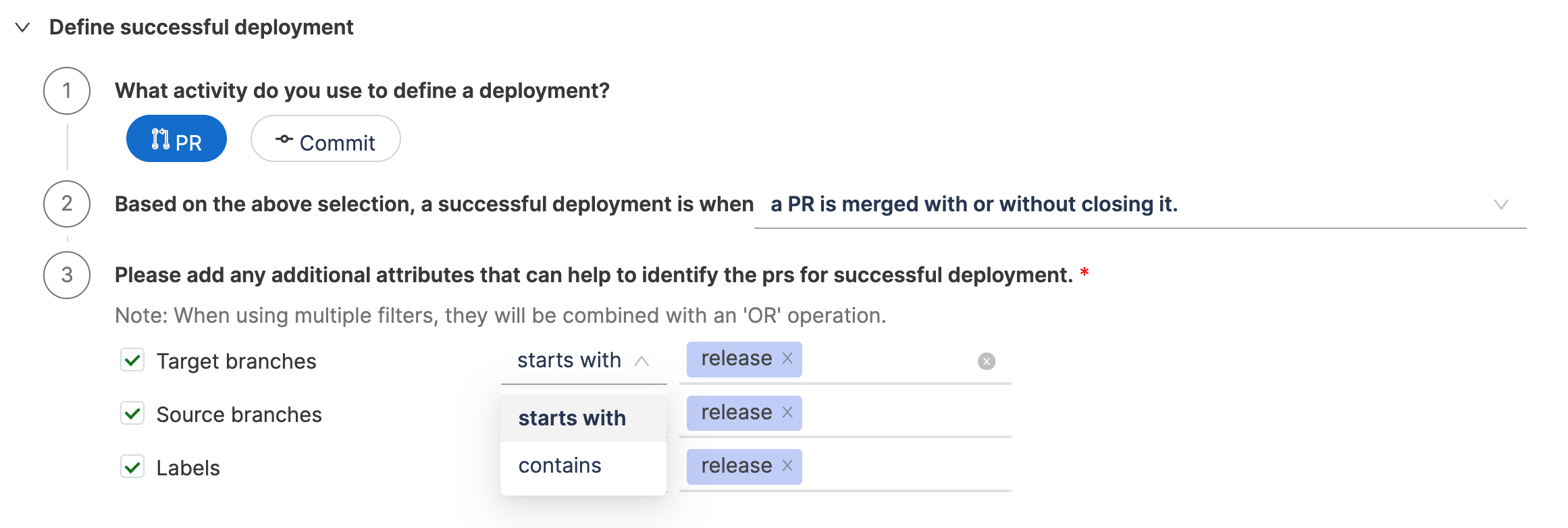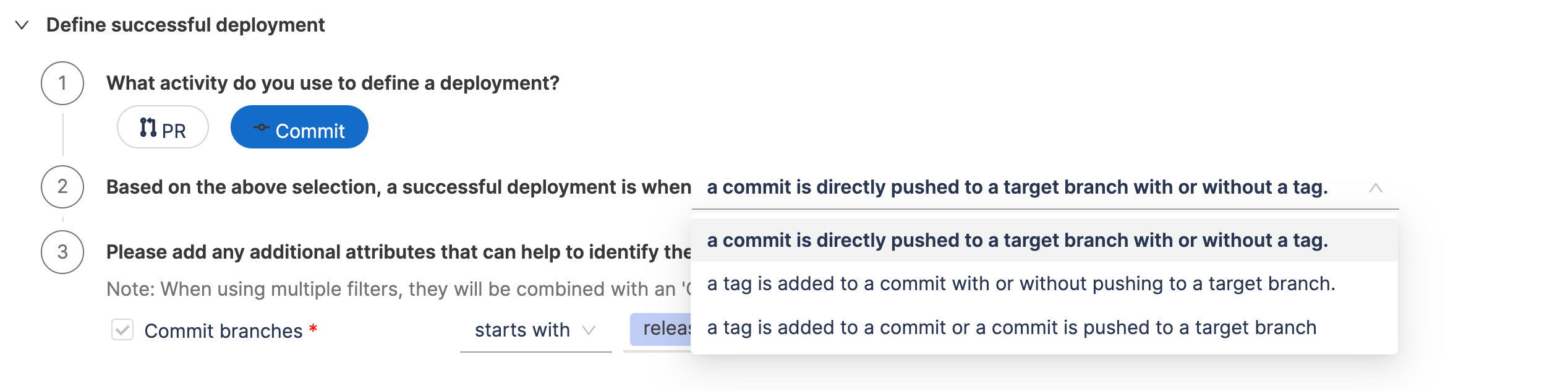• Defind the settings for how you want to calculate deployment frequency. The additional filters being used to define the deployments will be applicable to all the integrations that you selected.