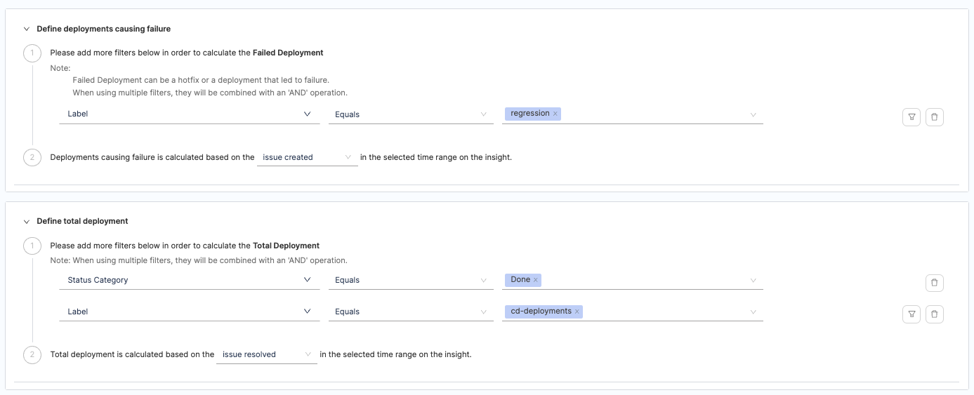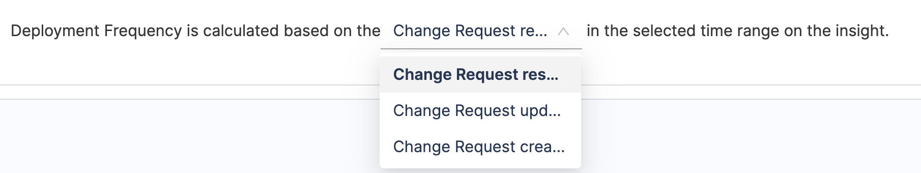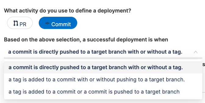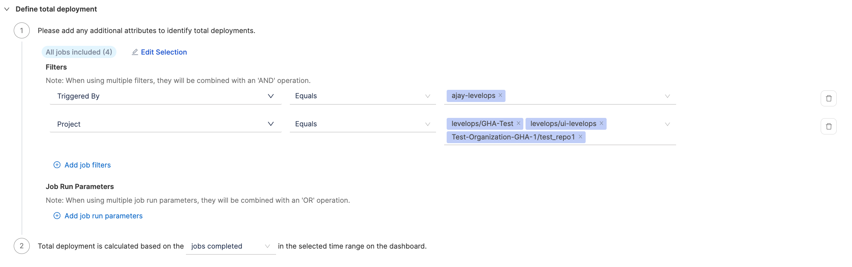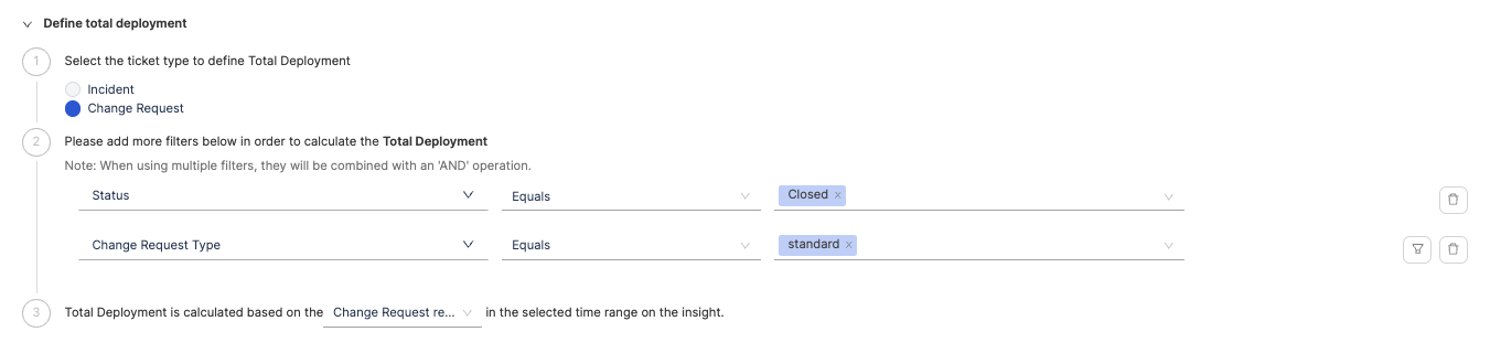 Similar to the deployments causing failure definition, you can configure the definition for measuring total deployments. This definition may align with the DORA Deployment Frequency definition. However, note that the total deployments are not linked with Deployment Frequency and are tracked separately for Change Failure Rate calculations.