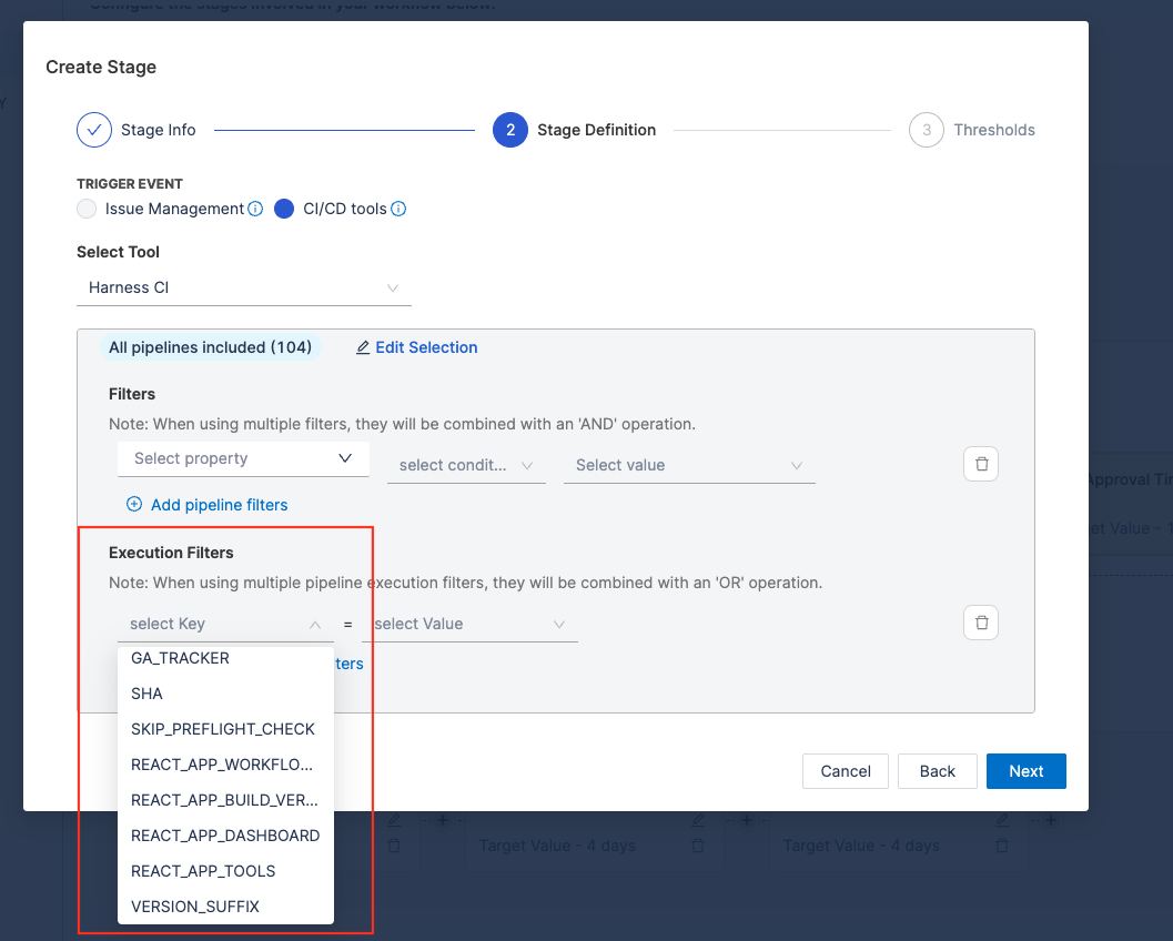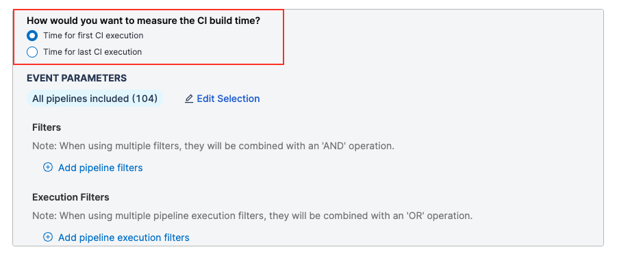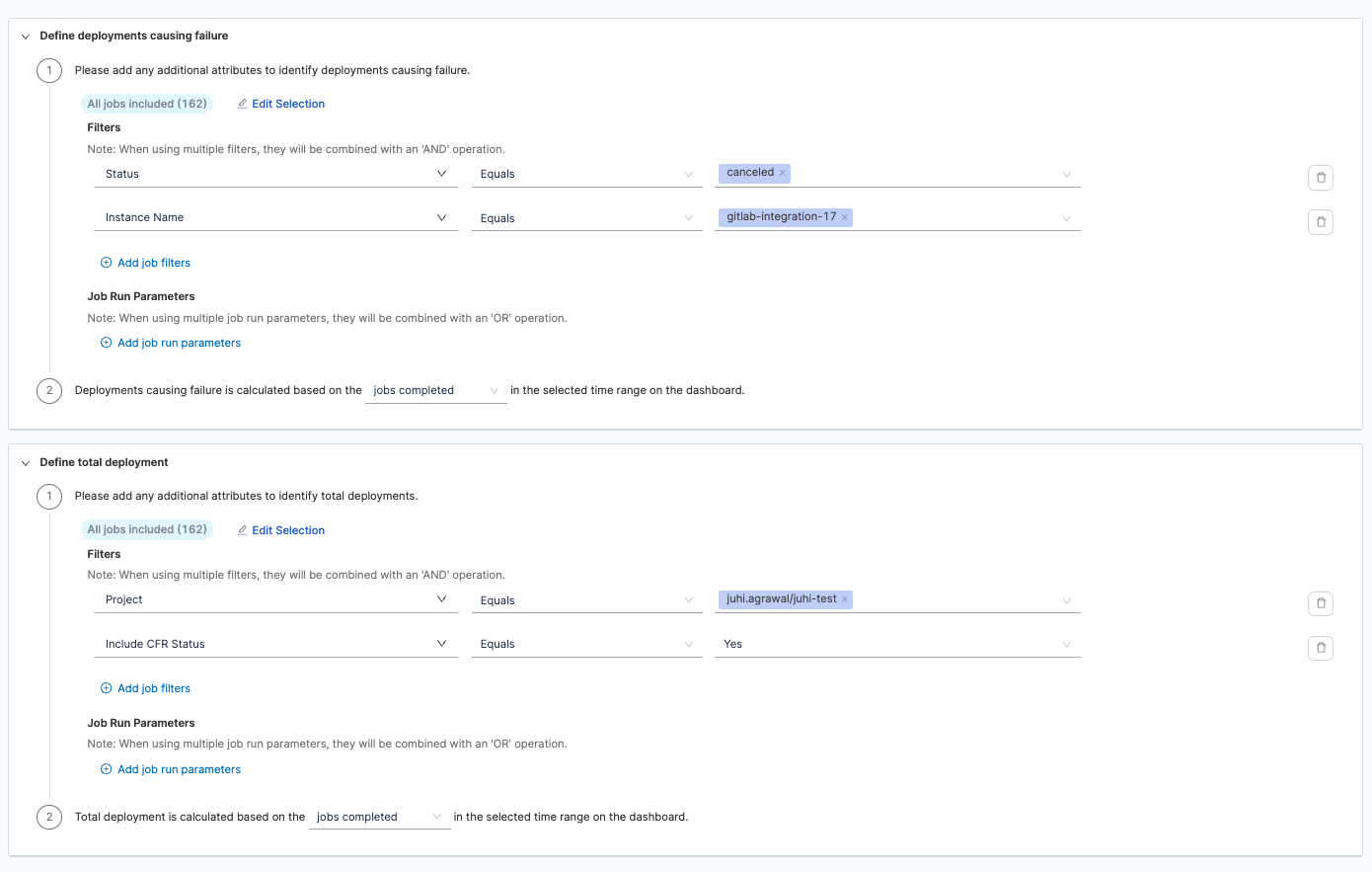 • Refine the calculation by specifying detailed filters. This filters pipelines that should contribute to the change failure rate calculations.