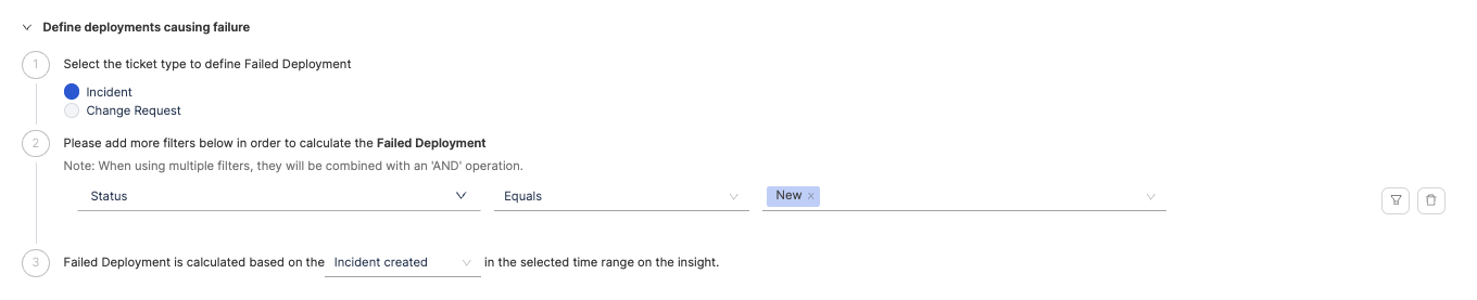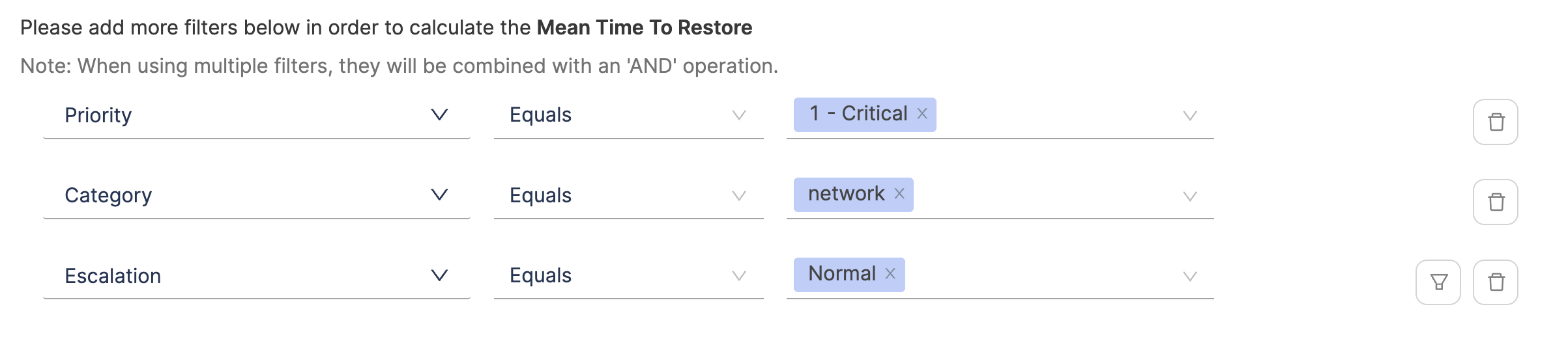 • Define incident criteria for calculating MTTR by selecting various filters that define incidents you want to track or measure for MTTR calculations.