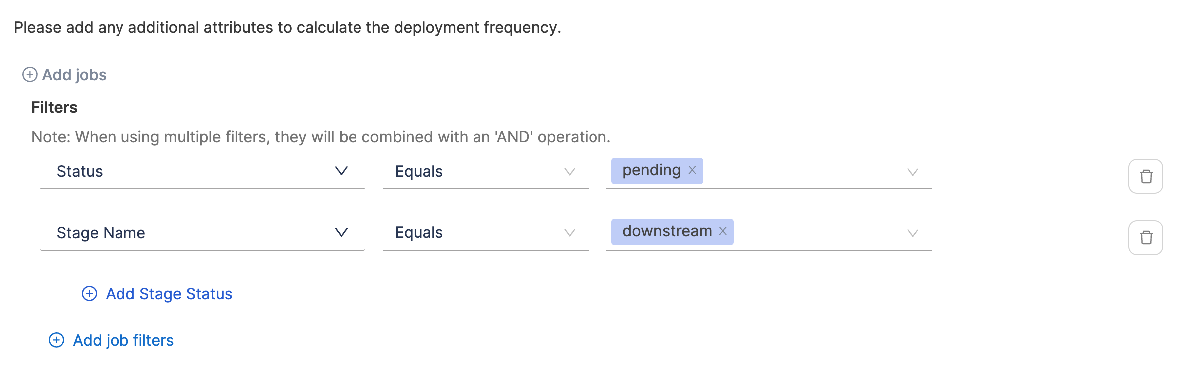 • Refine the deployment frequency calculation by specifying detailed filters. This filters pipelines that should contribute to the deployment frequency calculations.
