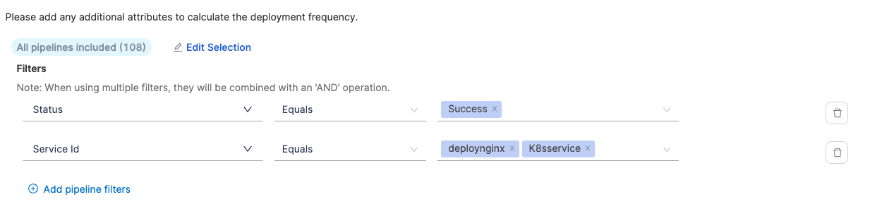 • Configure the additional attributes to calculate the deployment frequency. By default, all pipelines are included in the calculation, but you can customize the selection by manually selecting the pipelines.