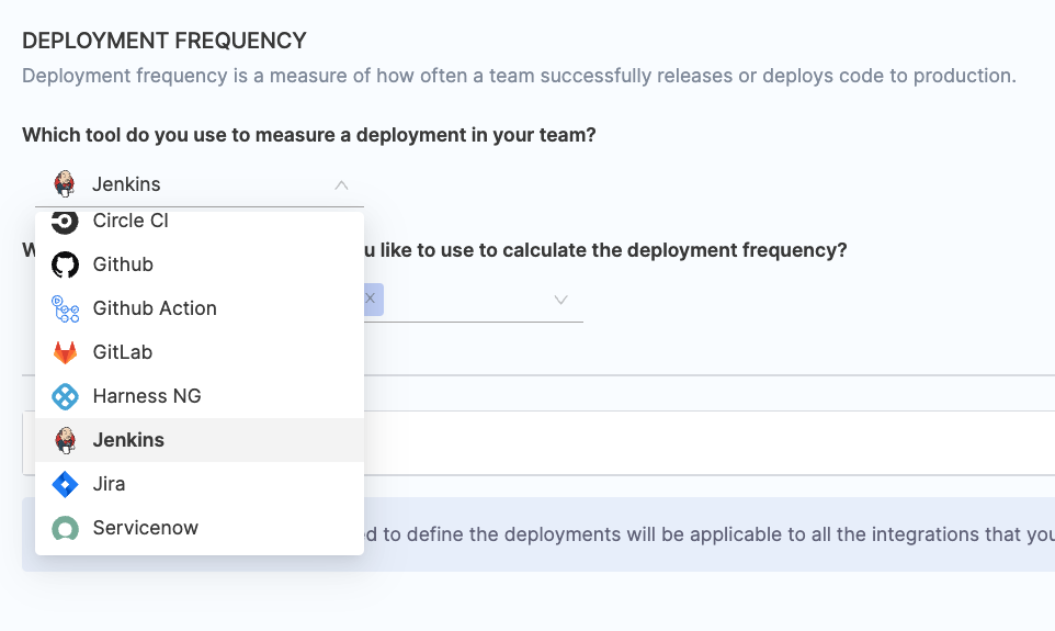 • Select all the integrations that you would like to use to calculate the deployment frequency.