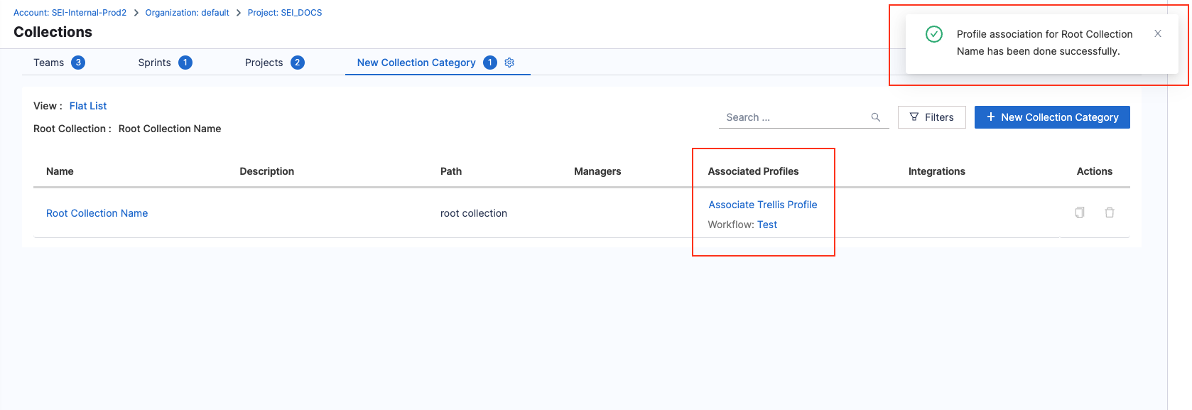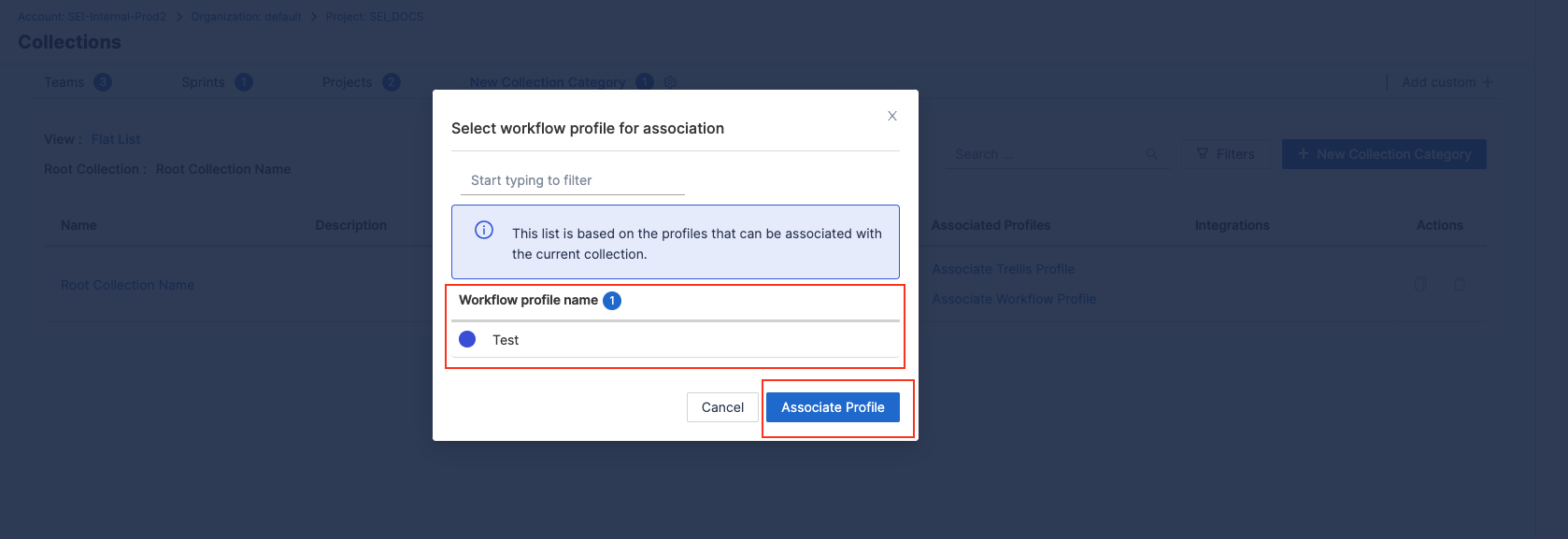 • To associate a DORA profile with the existing Collections, click on the Associate Workflow Profile option under the Associated Profiles column.