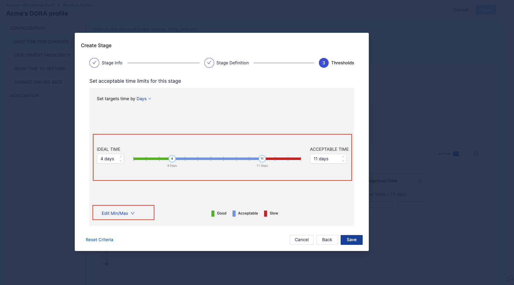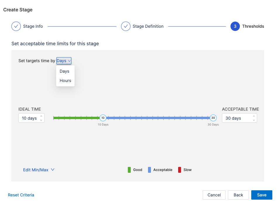 • Set acceptable time ranges for the stage, such as Ideal Time and Acceptable Time.