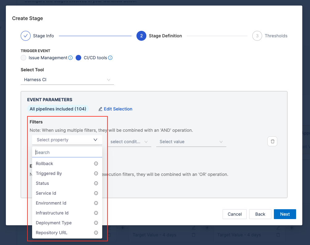 • Use filters to include or exclude pipelines based on specific properties, conditions, and values from the Harness CD pipeline configuration.