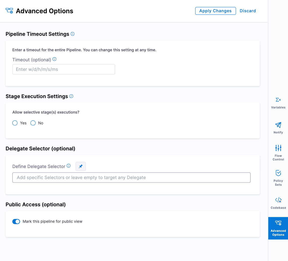 Added support for scoping a single Delegate to an Environment, Pipeline, or Stage. For CD pipelines, the option to add Delegate selectors at Pipeline, Stage, and Step group levels is introduced along with the existing Step level and Connector level.